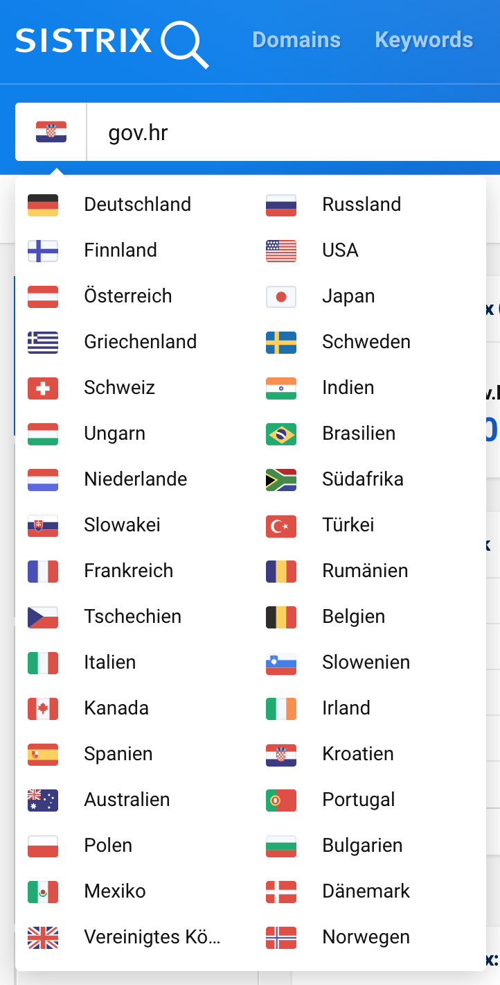 Ab sofort können in SISTRIX auch Sichtbarkeits- und Analysedaten für Rumänien, Kroatien, Slowenien und Bulgarien genutzt werden. Die Länder werden, wie gewohnt, über das Dropdown in der Suche ausgewählt: