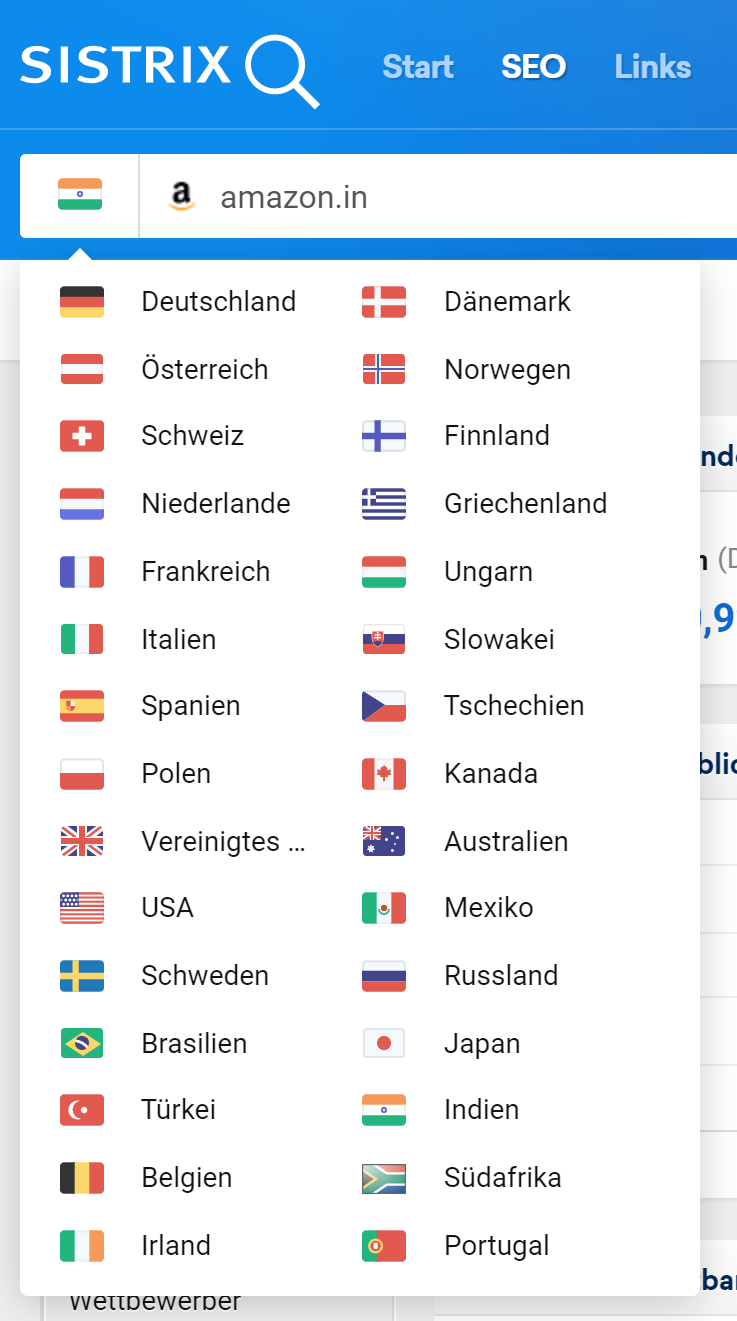 Der Zugriff ist entweder über das Länder-Dropdown neben der Suchleiste oder direkt über die entsprechenden Toolbox-Subdomains möglich: in.sistrix.com und za.sistrix.com