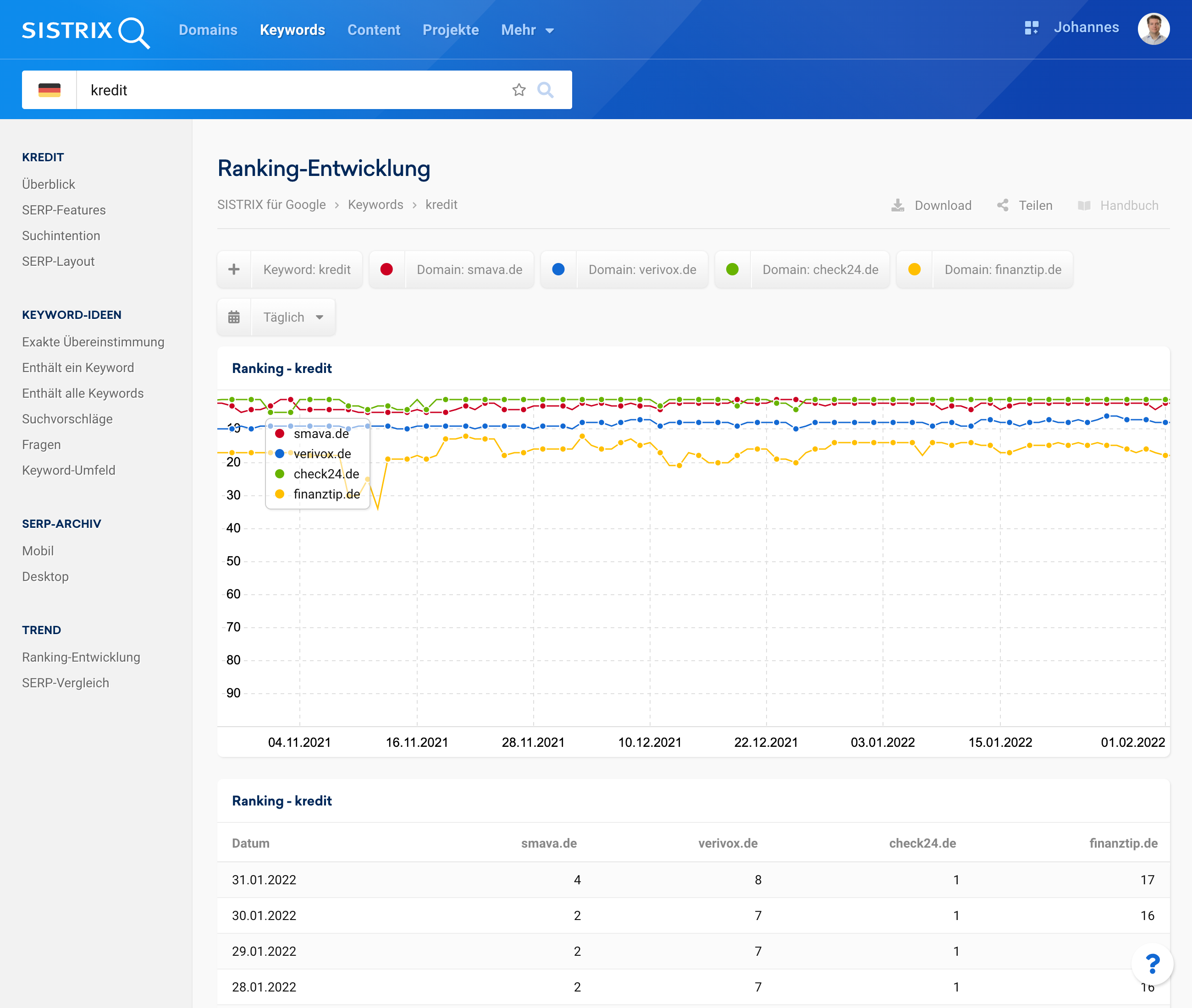 Ist ein Keyword ausgewählt, können bis zu vier Domains (oder wie bei SISTRIX üblich Hostnamen, Pfade, URLs) im zeitlichen Verlauf verglichen werden. So siehst du auf einen Blick, wie sich die Rankings der unterschiedlichen Wettbewerber für dieses Keyword entwickelt haben.