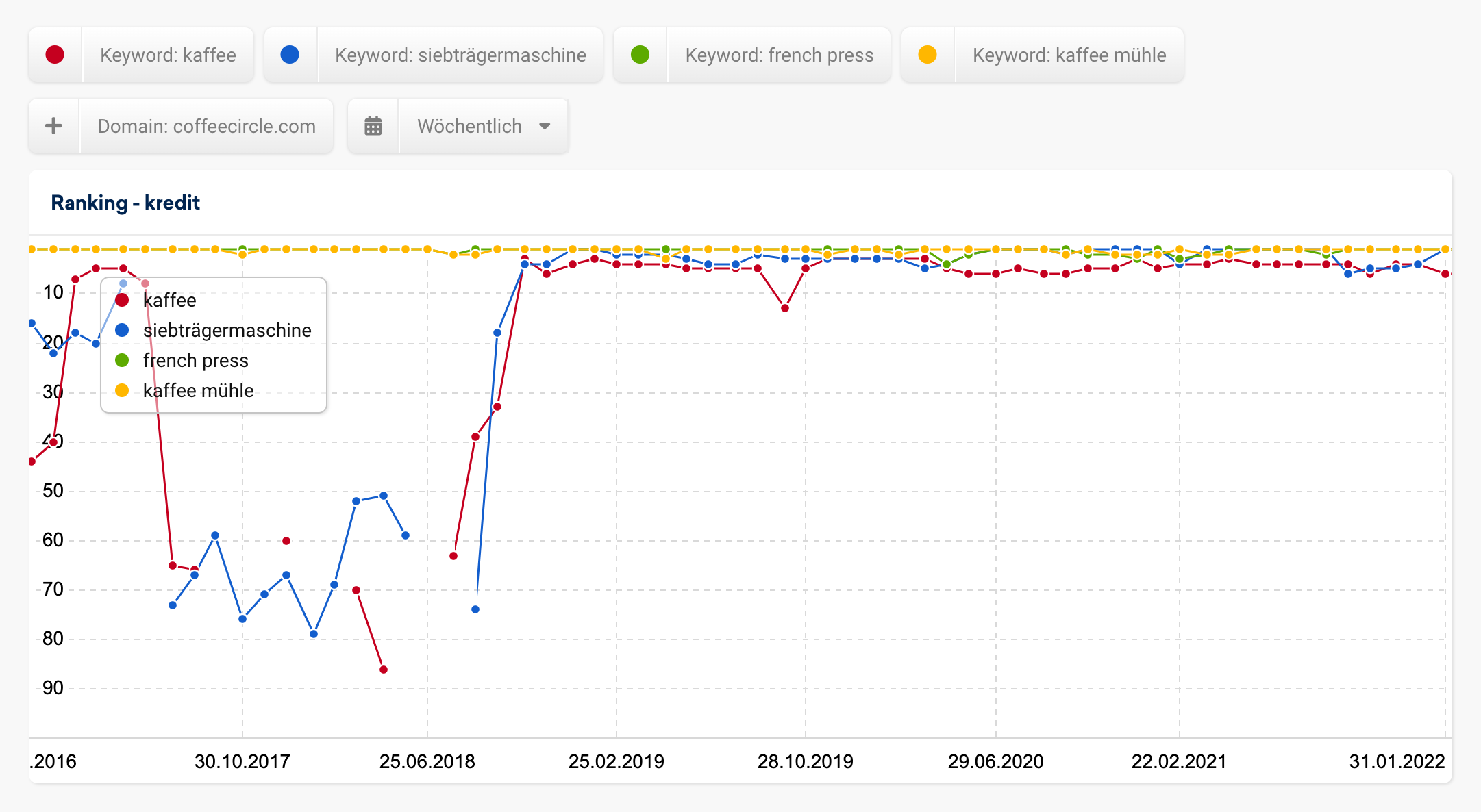 - Wöchentlich: Ranking-Daten vom jeweiligen Montag der Woche. Bis zu 5 Jahre zurück. Das ist die Standard-Ansicht mit einer Historie von einem Jahr, also 52 Datenpunkten.