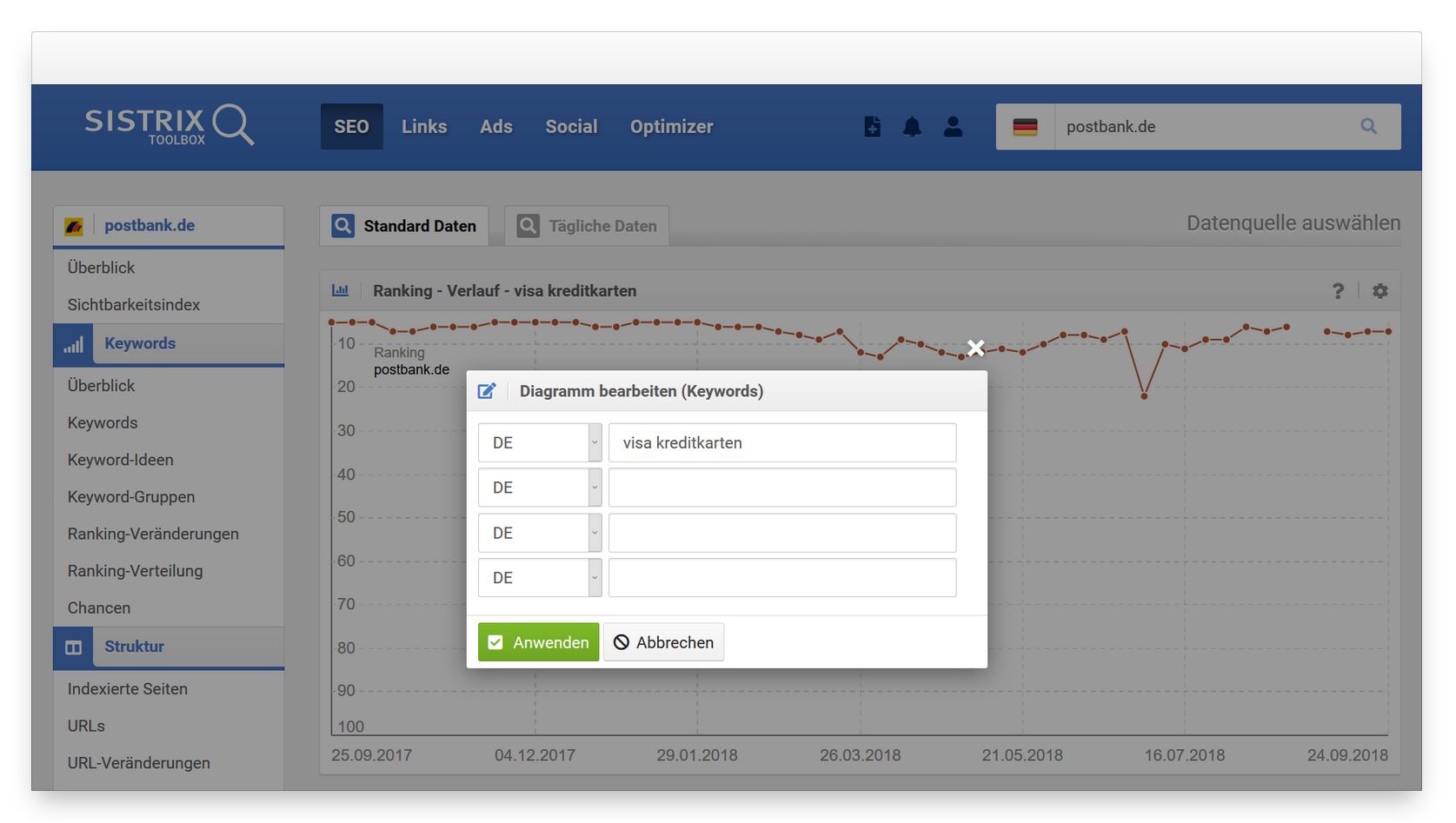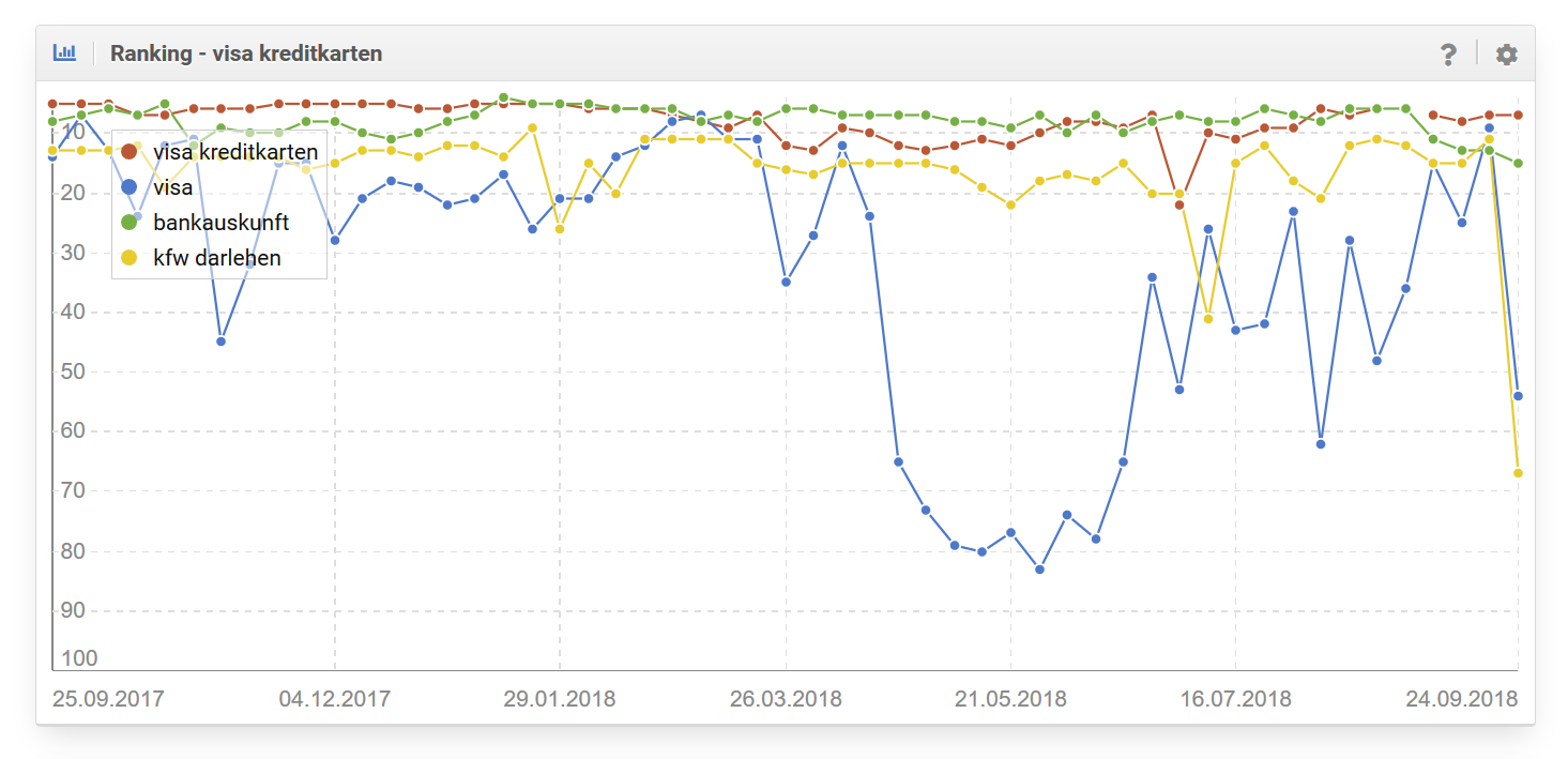 Verfolge die Rankingverläufe für bis zu vier Keywords zu einer Domain: