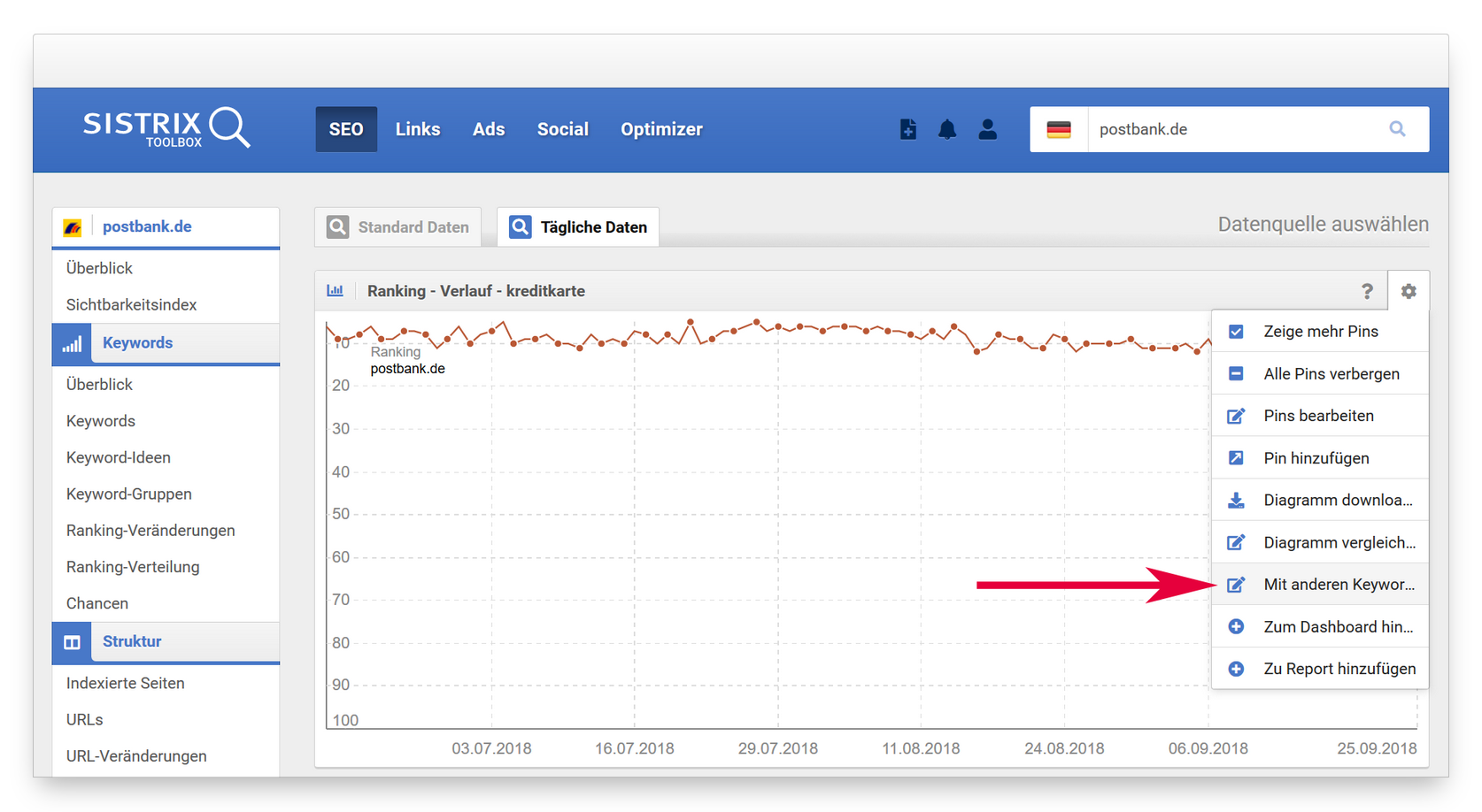 Die täglichen Daten für den Keywordverlauf haben eine Datenhistorie von 90 Tagen – so wie du es vom täglichen Sichtbarkeitsindex kennst.