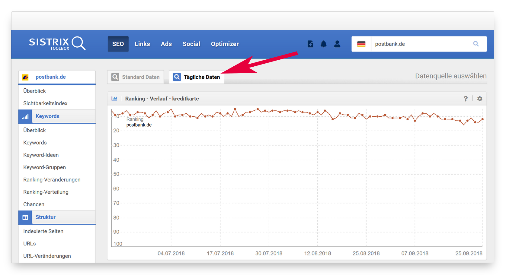 Zunächst siehst du den Rankingverlauf der vergangenen 12 Monate, auf Basis der Standard-Daten. Neu ist der Reiter „Tägliche Daten”, den du überhalb des Charts findest. Der Graph zeigt dir nun die täglichen Rankingpositionen der untersuchten Webseite der vergangenen drei Monate.
