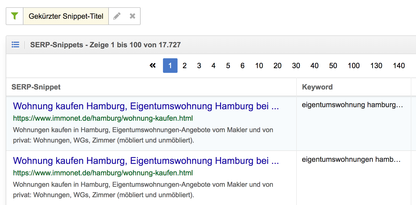 So zeigt der Filter “Gekürzter Snippet-Title” zum Beispiel Keyword/Snippet-Kombinationen, bei denen der Title zu lang ist, um ihn komplett in den Google-Ergebnissen anzuzeigen. Google kürzt ihn dann mit “…” ab und so gehen eventuell wichtige Informationen verloren: