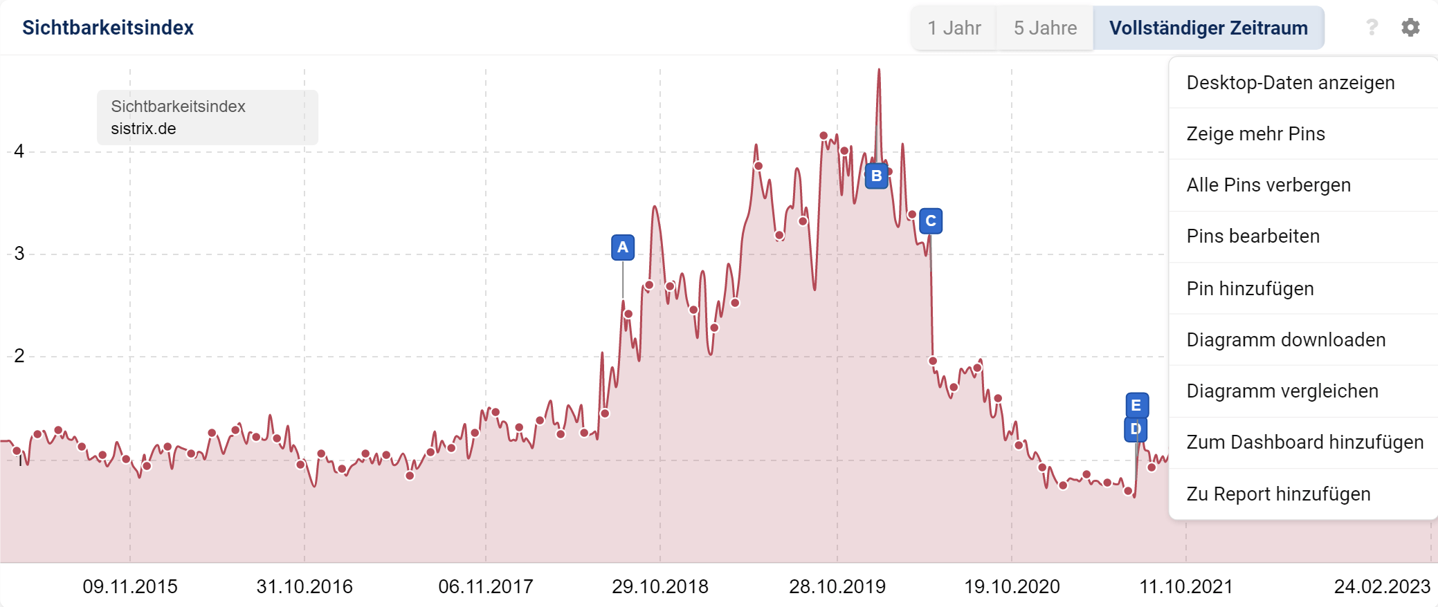 Dir wird jetzt die Überblickseite dieser Domain angezeigt, in der auch der grafische Sichtbarkeitsindex-Verlauf der Domain zu sehen ist. In dieser Grafik kannst du auf das Zahnrad am oberen rechten Rand klicken und dort „Diagramm vergleichen“ auswählen.