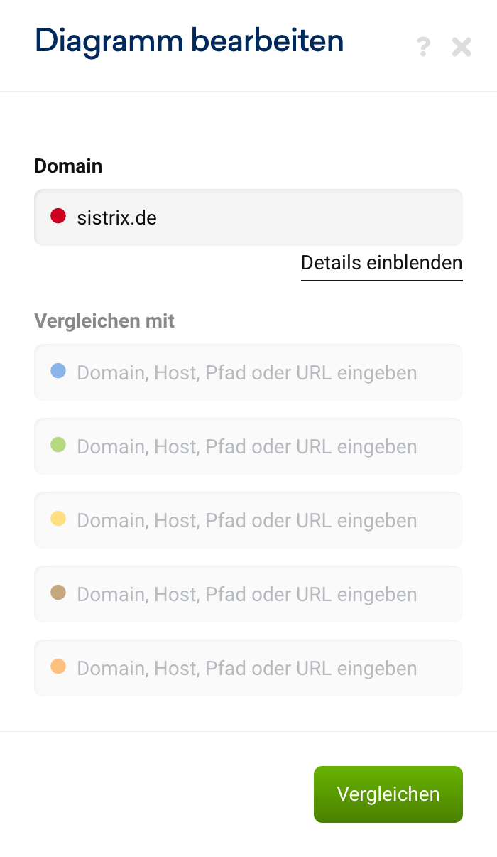 Hier lassen sich nun bis zu 6 Domains, Hosts, Verzeichnisse oder URLs  (oder eine Mischung dieser) eintragen, deren Verläufe wir in einer eigenen Grafik übereinander legen.
