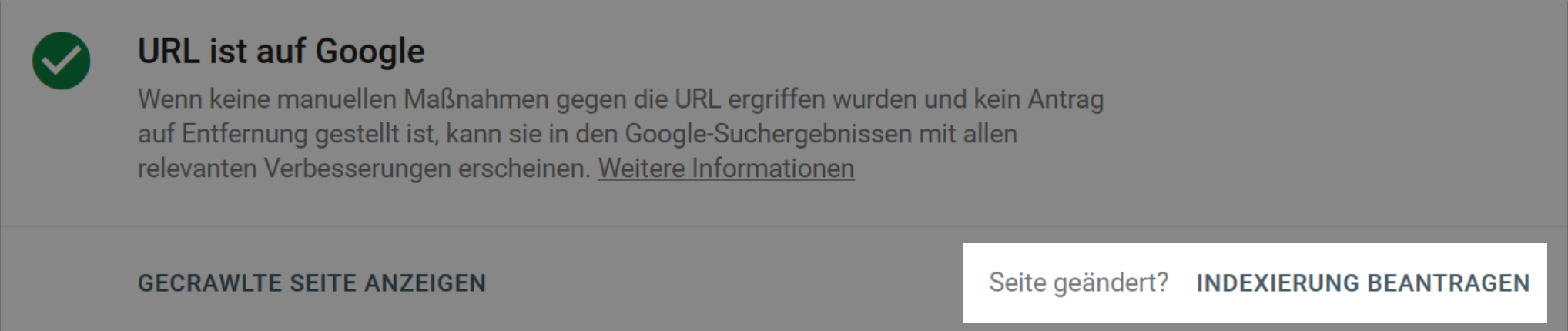 Nach der Prüfung, kannst du in der nächsten Ansicht die Indexierung durch Google beantragen – das funktioniert gleichermaßen für bereits indexierte Inhalte, wie hier dargestellt: