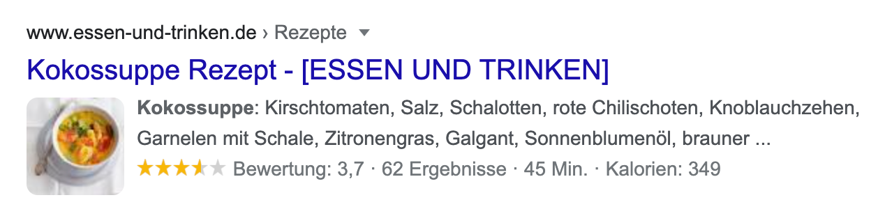 • Google reichert Suchergebnisse mit zusätzlichen Informationen an (Rich Snippets), zum Beispiel Bewertungssternchen, Öffnungszeiten oder die Zubereitungszeit von Rezepten. Das verschafft ihnen mehr Aufmerksamkeit.