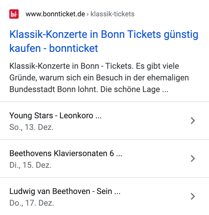 Wenn du deine Veranstaltung auf Ticketing-Portalen (Eventim etc.) eingetragen hast, sind die strukturierten Daten zum Event „inklusive“. Bedenke, dass der Klick über die Rich Snippets zwar zu mehr Ticketverkäufen, aber nicht zu mehr organischem Traffic auf deiner eigenen Website führt.