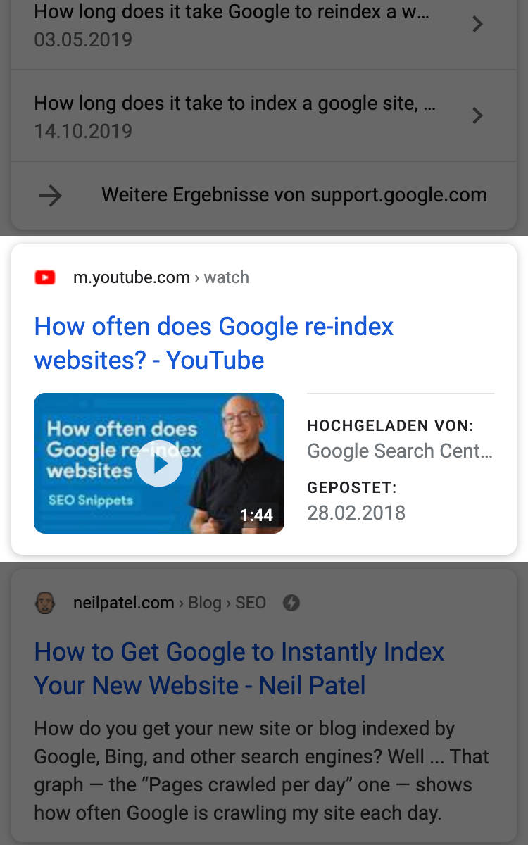 Anstatt darauf zu vertrauen, dass die Google-Bots diese Informationen von allein zu einem eindrucksvollen Suchtreffer zusammenfügen, solltest du strukturierte Daten zum Video einbetten und damit ein Video Rich Snippet generieren, das sofort zum Anschauen animiert.