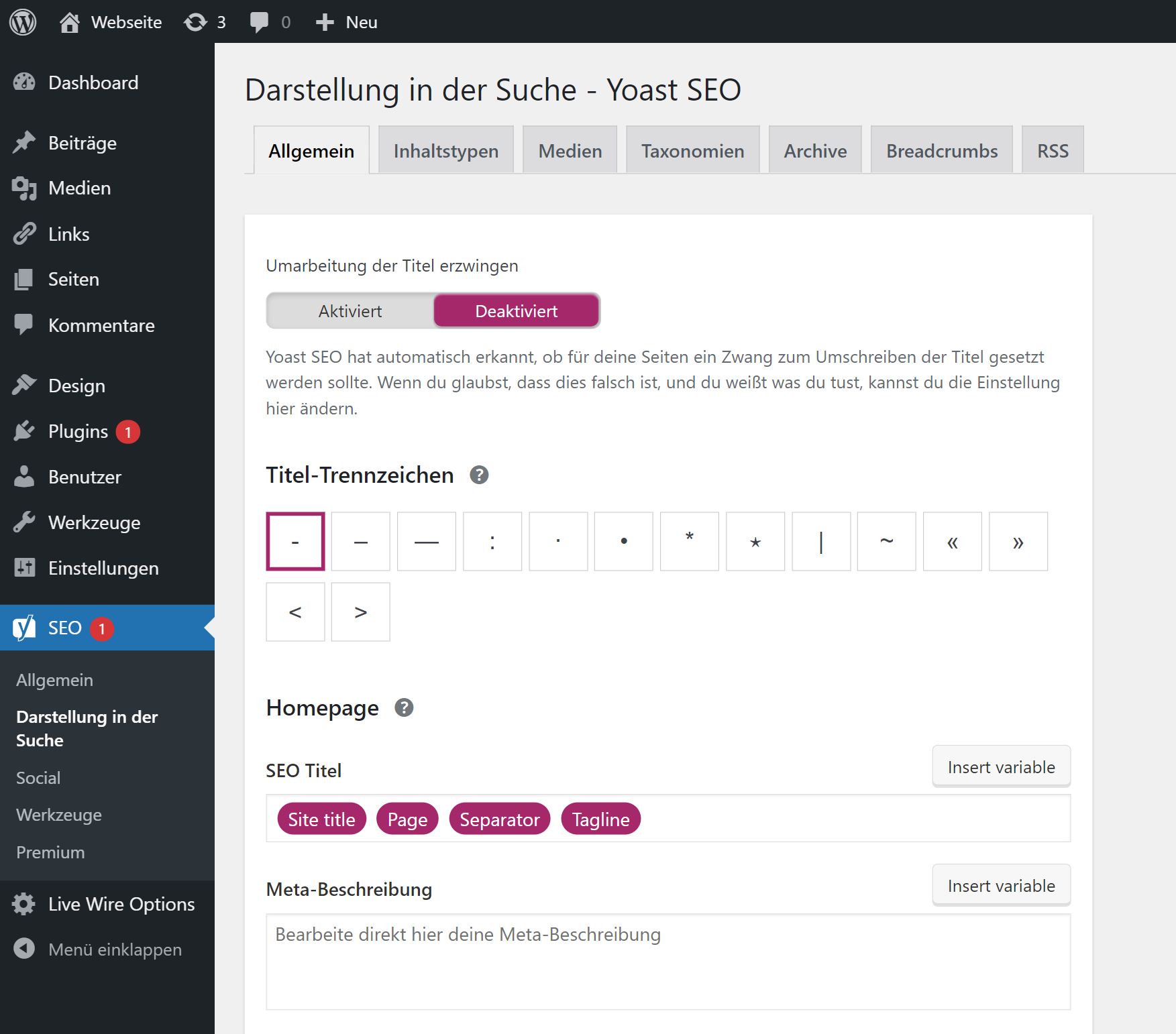 Für den SEO Title Tag in WordPress ist der Abschnitt Darstellung in den Suche zunächst besonders wichtig. Hier legst du einen Standard fest, der für alle Title Tags in WordPress gelten soll.