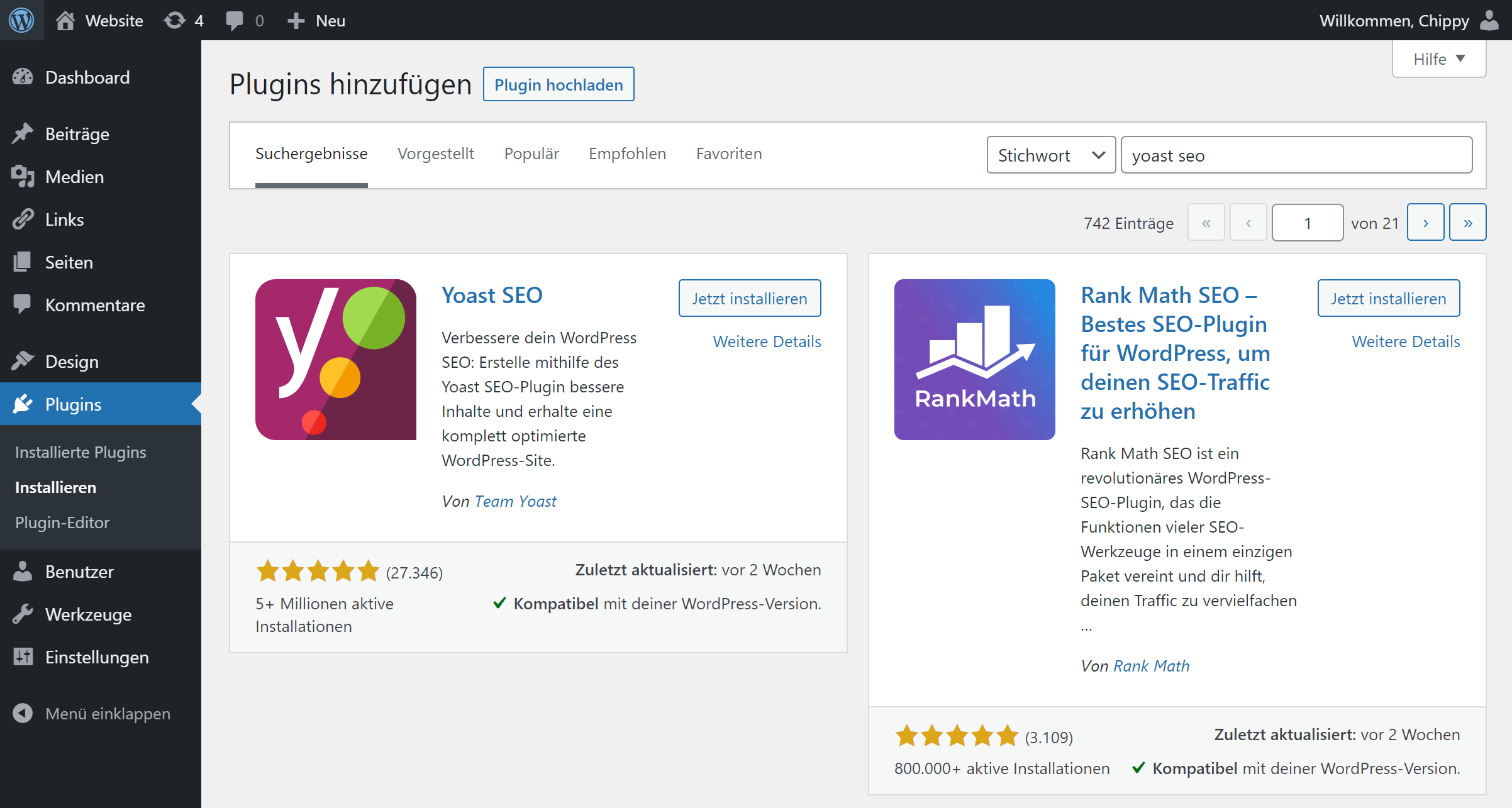 Zum Installieren der Plugins gehst du in WordPress auf Plugins > Installieren und suchst dir deinen Favoriten heraus.