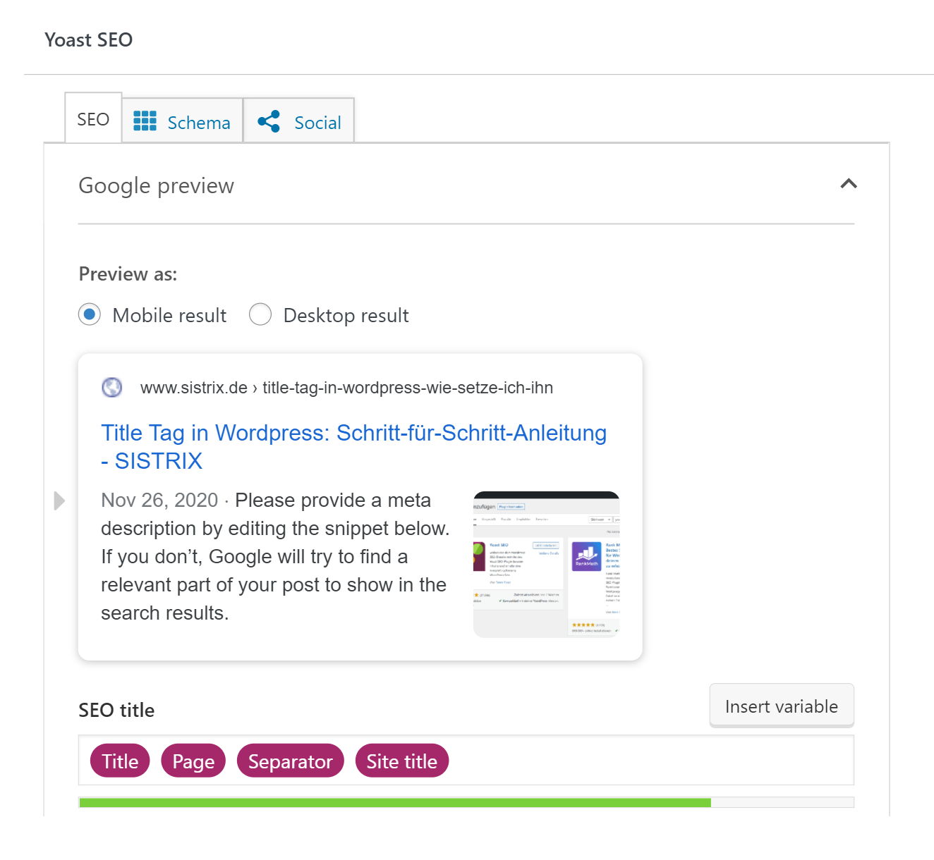Gebe deinen Title Tag für WordPress in die dafür vorgesehene Zeile der Eingabemaske ein. Auch die Meta Description kannst du direkt editieren.
