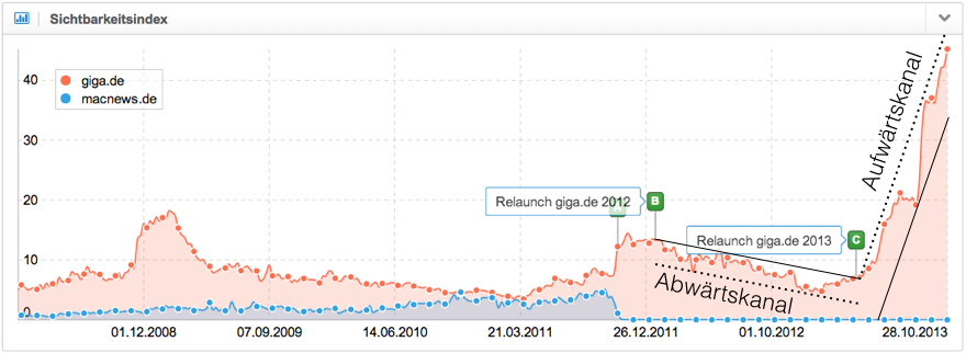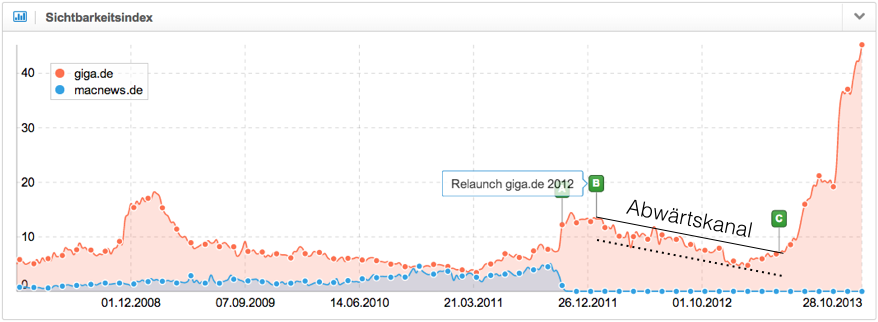 Econa hat aus seinen Fehlern gelernt und bei einem erneuten Relaunch von giga.de im April 2013 (Ereignis-Pin C) sehr viele Dinge richtig gemacht. Die Sichtbarkeit bei Google befindet sich seither in einem steilen Aufwärtskanal.