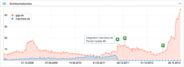 Zu diesem Zeitpunkt hatte Econa die im gleichen Jahr erworbene Plattform macnews.de auf giga.de überführt. Ebenfalls wurden 2011 die kleineren Portale macmagazin.de und maccommunity.de übernommen. Die Sichtbarkeit von macnews.de konnte weitestgehend auf giga.de übertragen werden. Mit dieser Aktion schaffte es giga.de in die Liste der SISTRIX IndexWatch Gewinner 2011 und wir haben darauf hingewiesen, dass solche Mergers & Acquisitions in Zukunft ein interessantes Wachstumsmodell im SEO-Bereich sind, um schnell mehr Links und mehr Content zu realisieren.