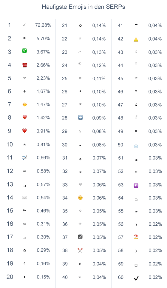 Wenig überraschend ist die Vielfalt der gefundenen Emojis im Snippet-Text sowohl auf dem Desktop als auch auf dem Smartphone deutlich größer. Zum Abschluss noch eine Auswertung über die Emojis, die wir am häufigsten in den SERPs (sowohl Snippet als auch Title) gesehen haben: