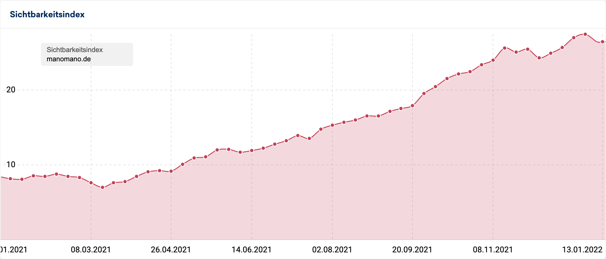 Ebenso beeindruckend stabil wachsen konnte der Online-Heimwerkermarkt der französischen Colibri SAS unter manomano.de. Mit Sicherheit von Corona beflügelt leistet man hier konstant hervorragende SEO-Arbeit und baut das Inventar kontinuierlich aus, so dass man im Jahr 2021 die Sichtbarkeit mehr als verdreifachen konnte (+211% von 8,8 auf 27,5):
