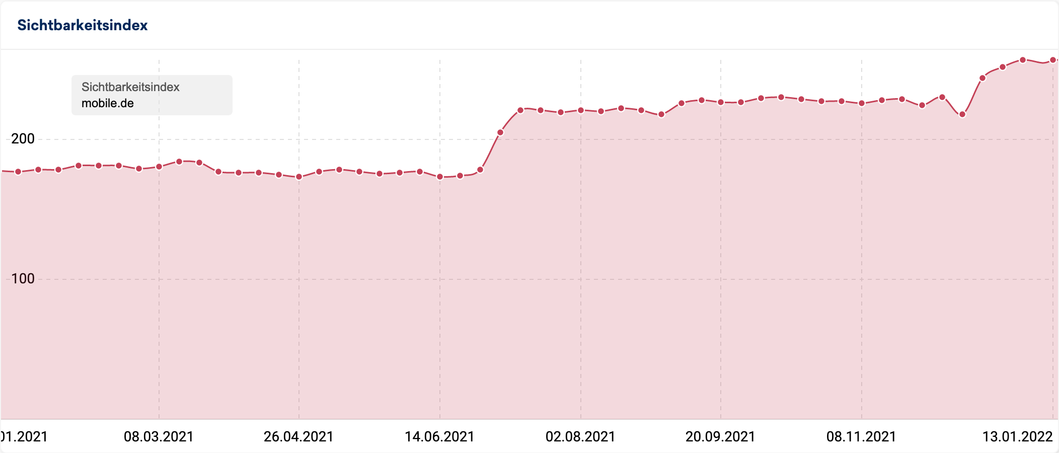 Für die SEO-Gewinner des Jahres 2021 haben wir den Sichtbarkeitsindex von knapp 10 Millionen Domains von Anfang 2021 (04.01.2021) und Anfang 2022 (03.01.2022) miteinander verglichen. Der YoY-Vergleich basiert auf dem mobilen Sichtbarkeitsindex, also den Zahlen, die aus der Messung der Suchergebnisse auf dem Handy basieren.