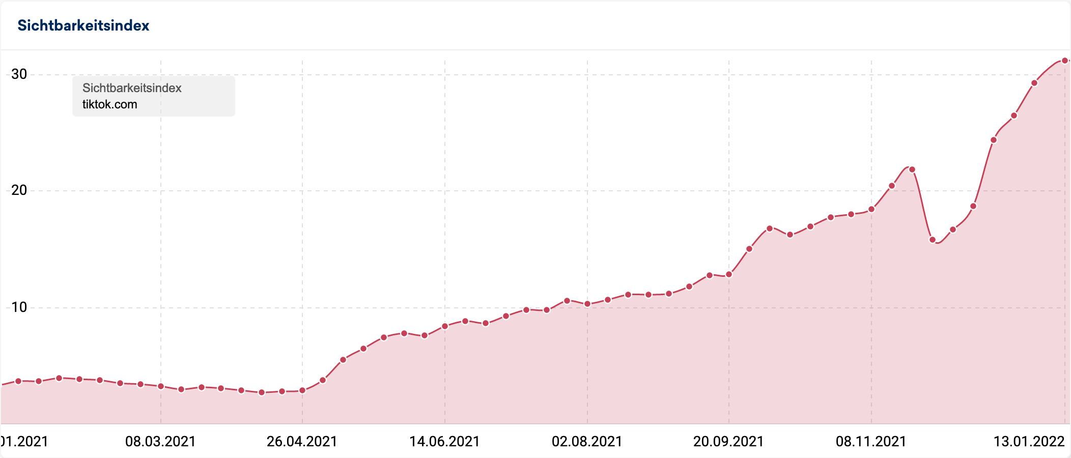 So konnte die Domain innerhalb des Jahres 2021 stolze 142 Sichtbarkeitspunkte zulegen (von 360 auf 502) und landet damit in der Liste der absoluten Gewinner des Jahres ganz knapp auf Platz 2: