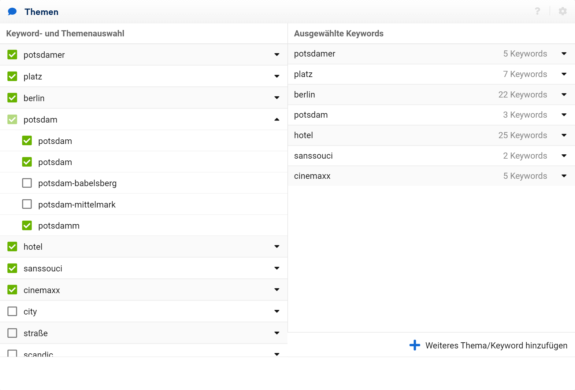 Wähle die Keywords aus, die du in deinem Projekt sehen möchtest oder füge neue hinzu. Die hinzugefügten Keywords werden in der „Themen“-Box auf der rechten Seite des Editors angezeigt.