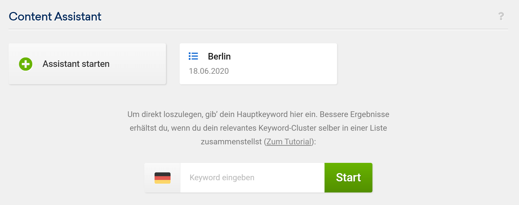 Wenn du ganz bei Null anfängst, musst du nur ein Seed-Keyword in das Suchfeld eingeben und das gewünschte Land auswählen. Der Content Assistant sammelt dann Daten für dich und bereitet das Projekt so schnell wie möglich vor.