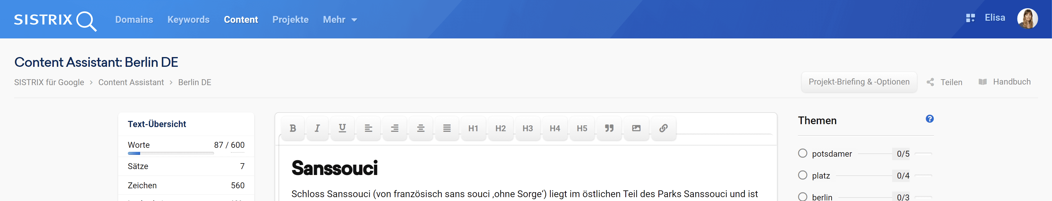 Das Interface des Content Assistenten hilft dir, dich auf die Erstellung des besten Textes zu fokussieren. In einem großen Textfeld in der Mitte kann es losgehen. Dort stehen dir die üblichen Formatierungsmöglichkeiten für Texte zur Verfügung. Du kannst hier auch einen bereits erstellten Text einfügen und ihn nach den verschiedenen Vorschlägen optimieren.