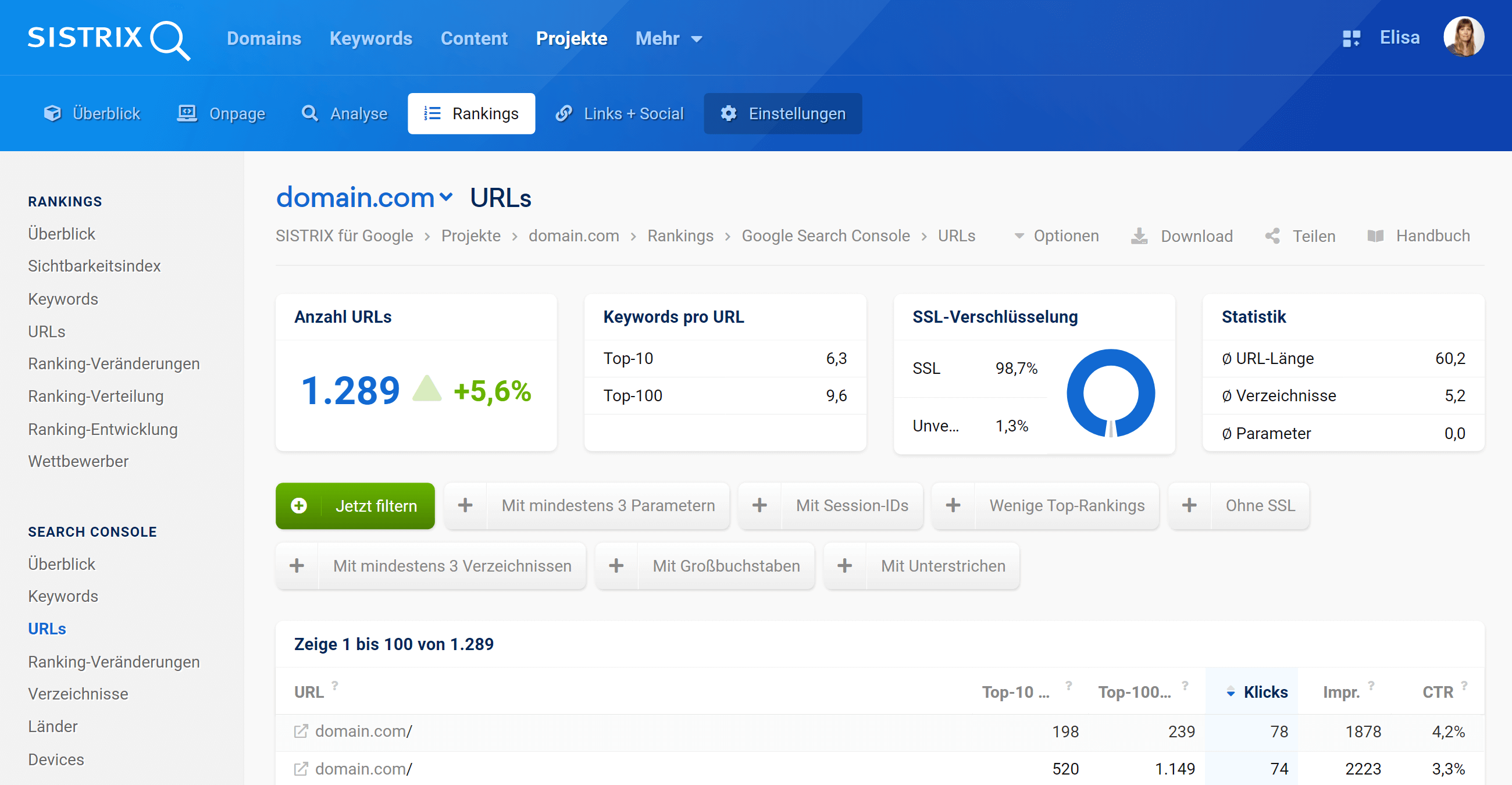 - SSL-Verschlüsselung: zeigt nur die URLs an die über das verschlüsselte Protokoll https laufen (SSL) oder über das unverschlüsselte Protokoll http ausgeliefert werden (Quickfilter: “Ohne SSL”).