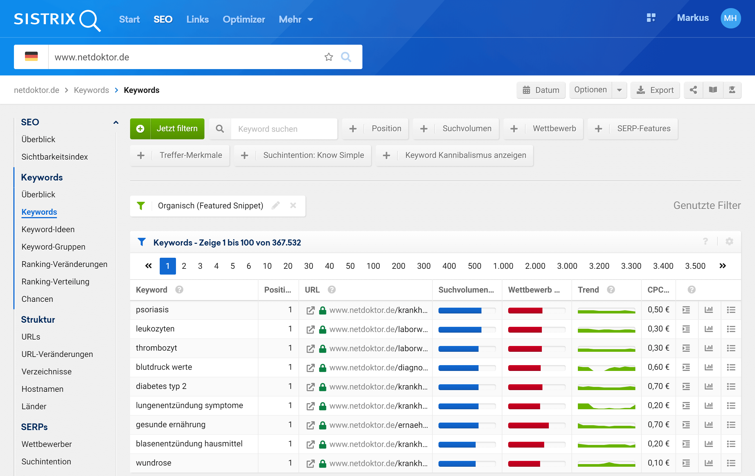 Wer also bspw. anderen Websites ihre Featured Snippets „stehlen“ möchte, kann in SISTRIX einfach prüfen, für welche Suchanfragen es bereits Featured Snippets gibt – und dann die eigenen Texte entsprechend optimieren.