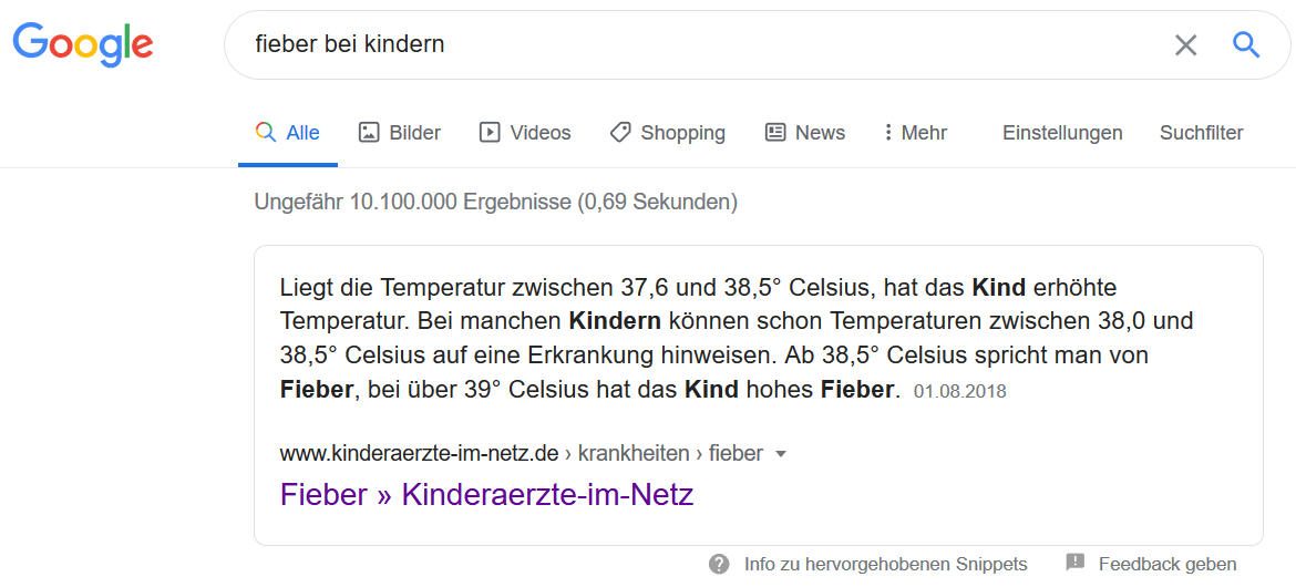Ein Thema, das im Zusammenhang mit Text angesprochen werden sollte, ist Featured Snippets. Dabei handelt es sich um einen hervorgehobenen Textausschnitt – wie hier bei einer medizinischen Suchanfrage: