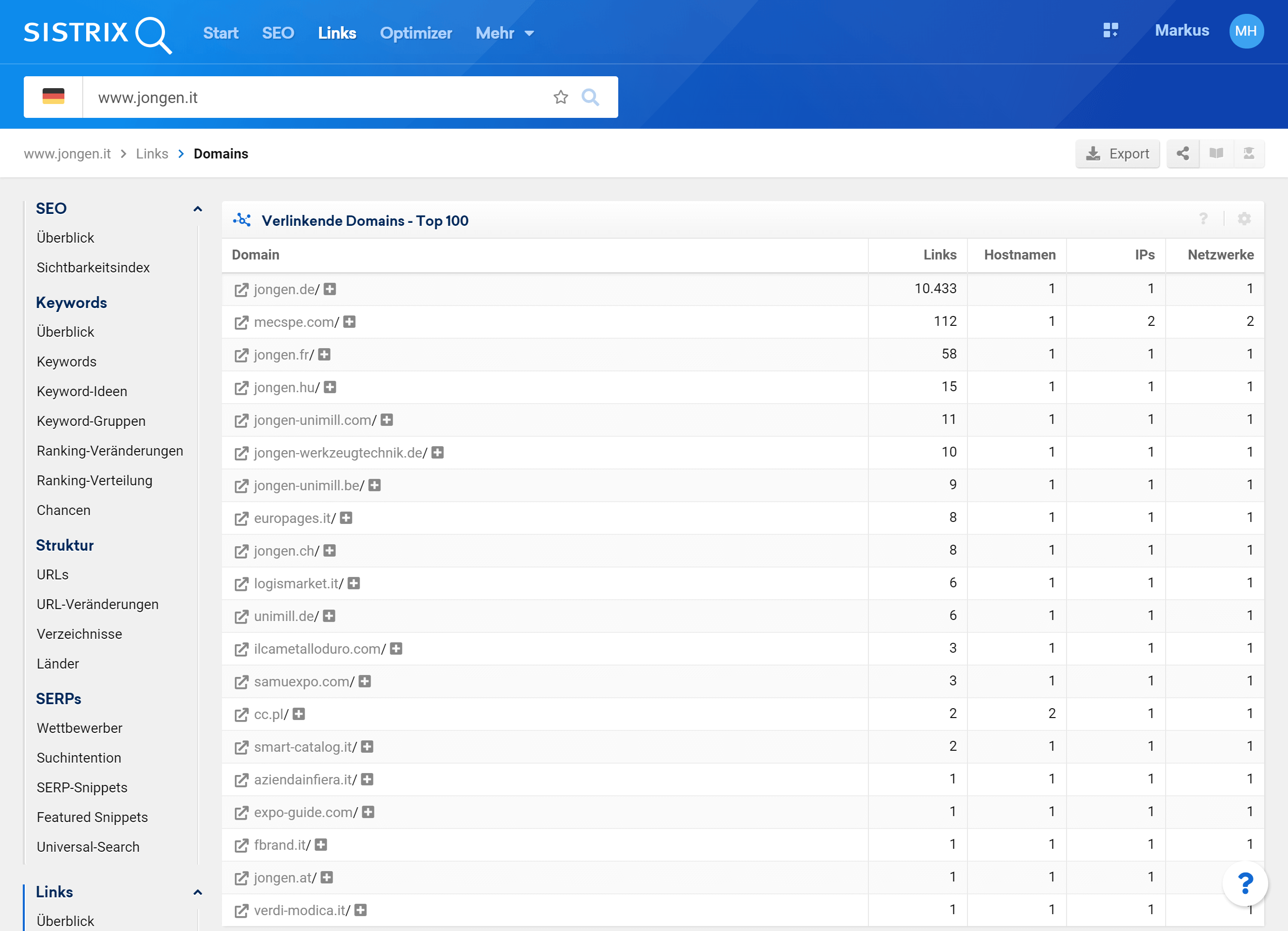 Da lohnt sich aber ein kritischer Blick bzw. ein tieferer Blick auf die Daten. Ein Beispiel: Die Firma Jongen Werkzeugtechnik hat sich dafür entschieden, für jedes Land eine eigene Domain zu nutzen (www.jongen.de, www.jongen.it …). Die so genannte Domain Popularität der Domain www.jongen.it wird bei SISTRIX mit 20 angegeben, d. h. dass 20 verschiedene Domains auf diese Domains verlinken. Wenn man sich die verlinkenden Websites anschaut, merkt man aber schnell, dass hier auch viele „interne Links“ von anderen Jongen-Domains dabei sind:
