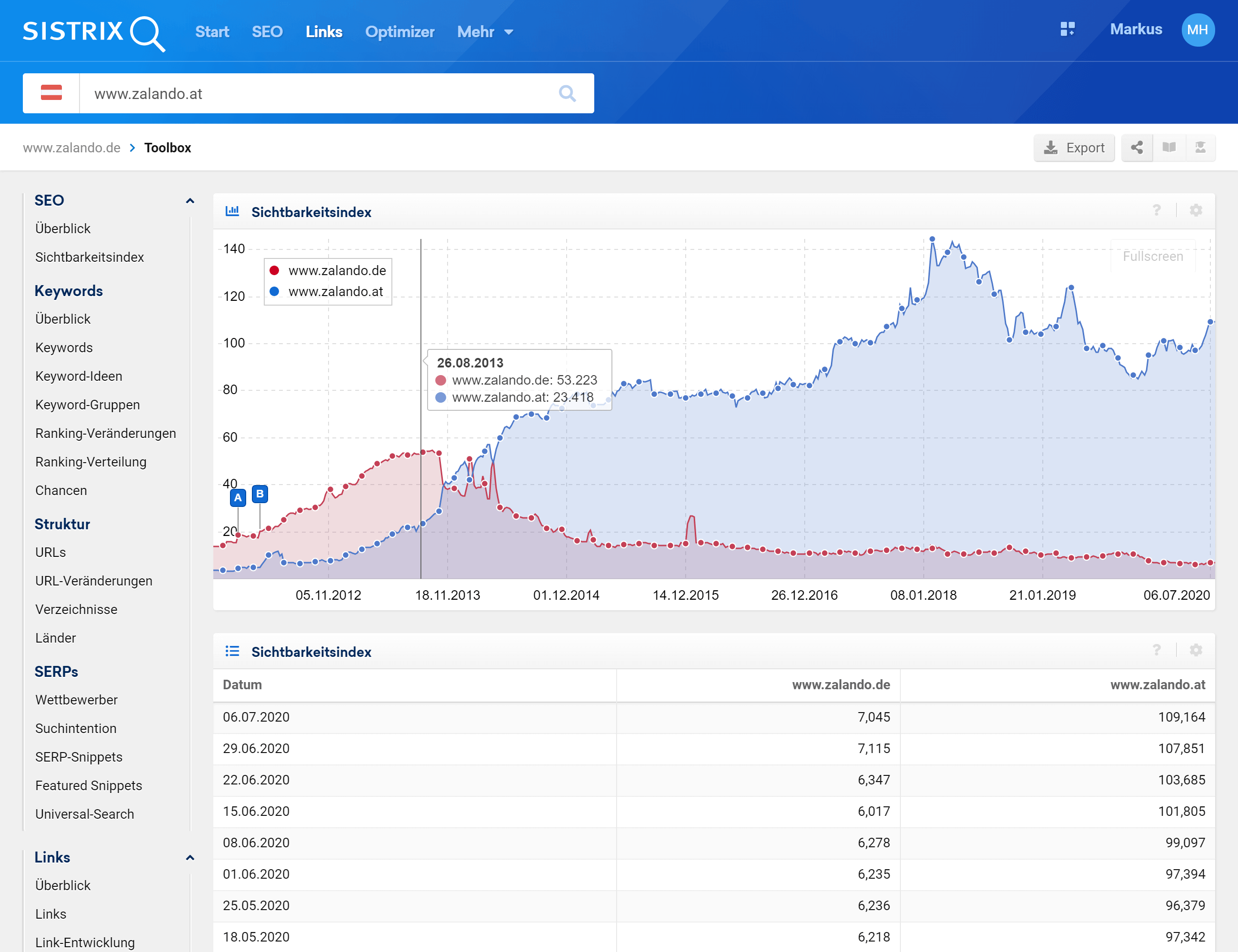 Falls Du in jedem Land eine eigene Domain nutzen möchtest, musst Du eine zentrale Frage ehrlich beantworten: Schaffst Du es in jedem Land, ausreichend viele externe Backlinks zu erhalten? Um hier den Status Quo zu ermitteln, kann man natürlich sehr gut die SISTRIX-Link-Datenbank benutzen, die zu jeder Domain anzeigt, von wie vielen anderen Domains diese verlinkt wird.