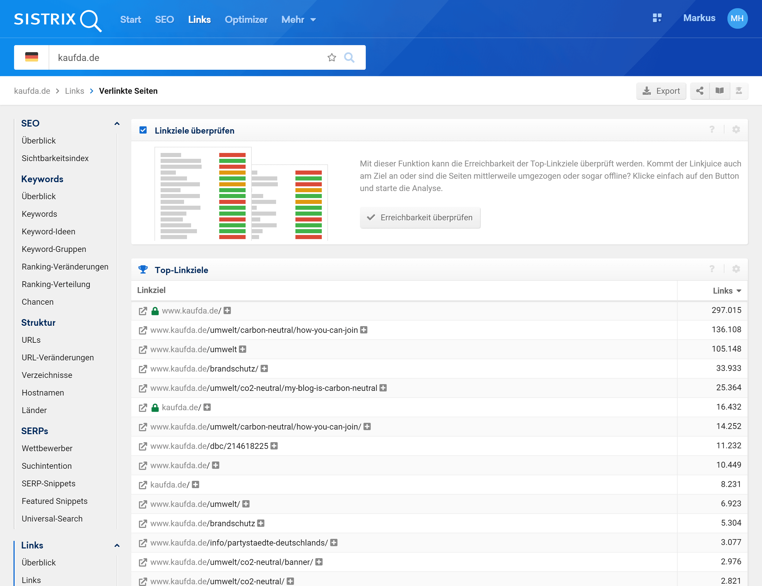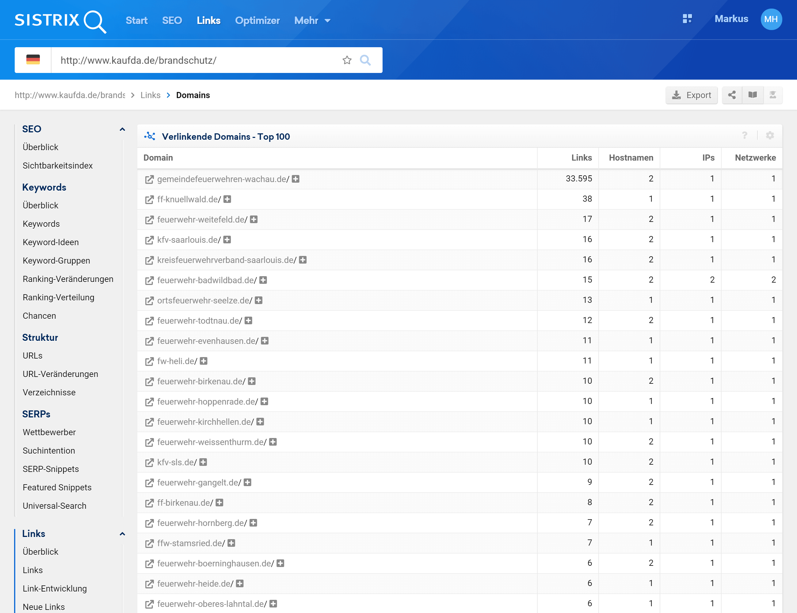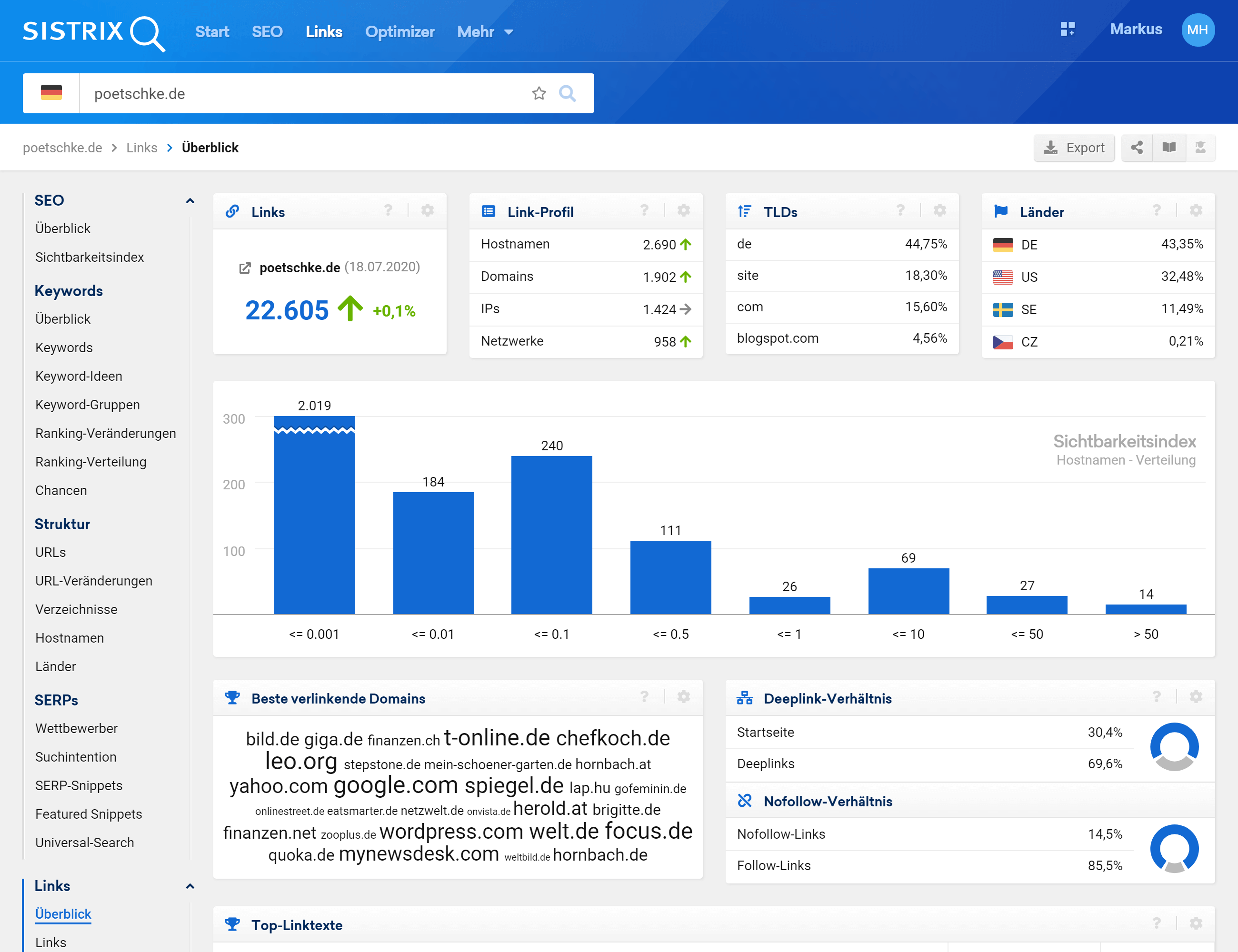 Dennoch ist es sinnvoll, die Backlinks aller Wettbewerber einzusehen, um eine ungefähre Vorstellung für die Situation zu bekommen. Die nötigen Daten erhält man im Links-Modul über die Übersichtsfunktion im Kasten „Link-Profil“: