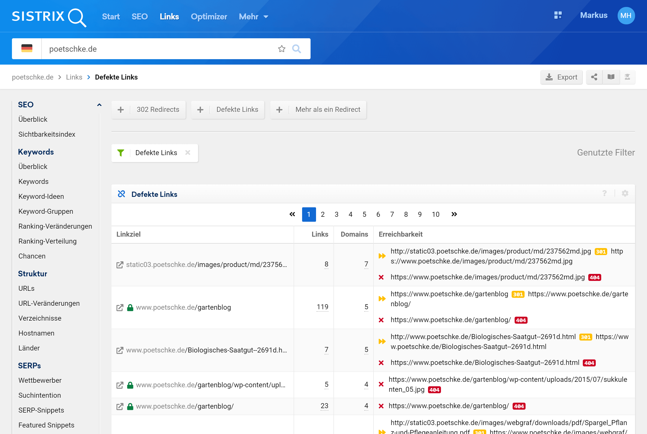 Der einfachste Linkaufbau besteht natürlich darin, Links zu reparieren, die es bereits gibt. Also: Eine andere Website verlinkt bereits auf deine Website, aber der Link ist defekt, sodass typischerweise ein 404-Fehler entsteht. Derartige Links können leicht im Link-Modul identifiziert werden: