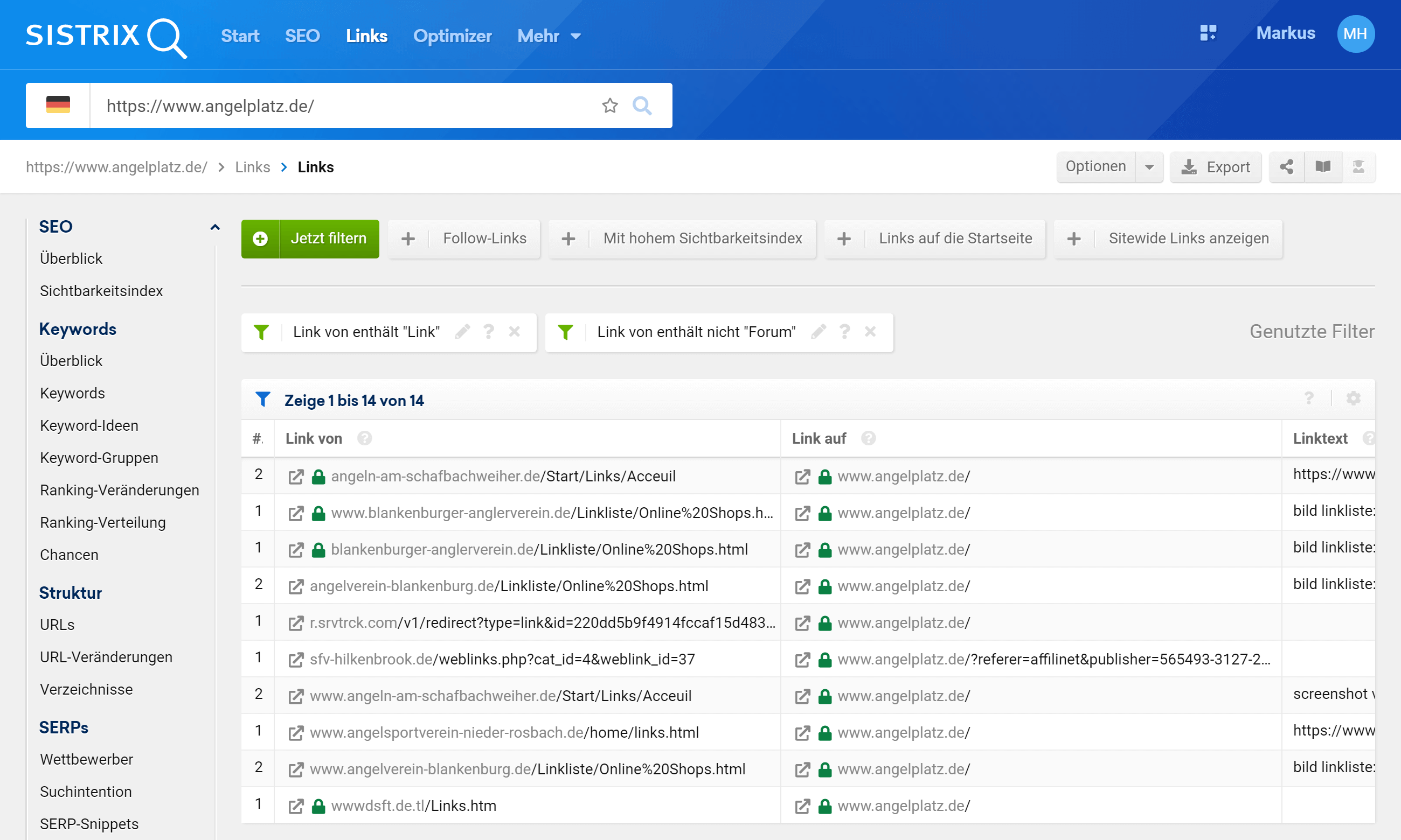 Bei der dritten Strategie geht es darum, dass Websites, die bereits auf Wettbewerber verlinken, auch für eine Verlinkung der eigenen Website angefragt werden. Die folgende Auswertung der Backlinks eines Angel-Shops zeigt, dass es z. B. bei einigen Angelvereinen Linklisten gibt: