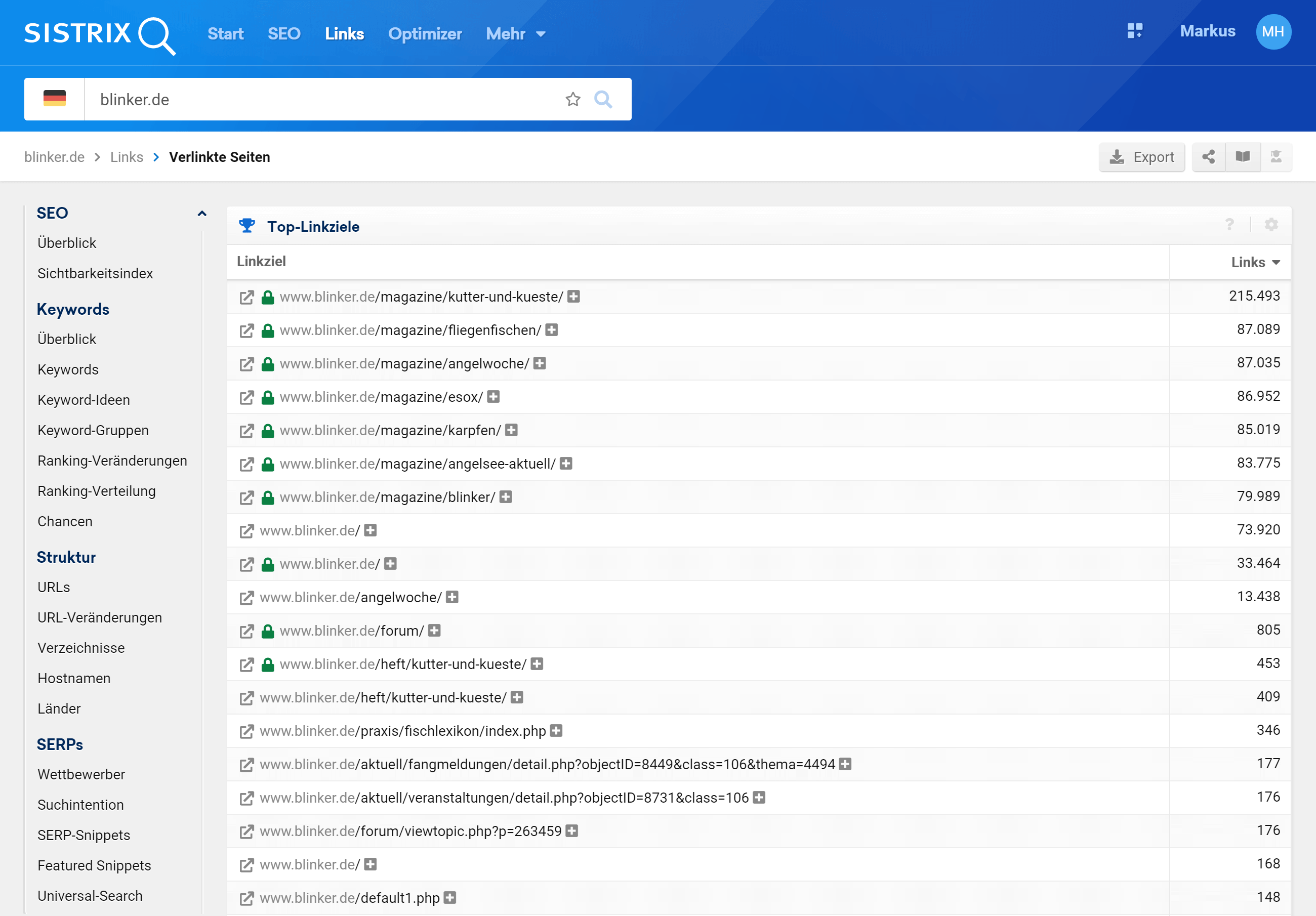 Deutlich höhere Chancen eröffnen sich, wenn der thematische Blick auf die realen Probleme und Interessen der Kunden gerichtet wird – losgelöst von der eigenen Palette an Produkten und/oder Leistungen. Auch hier kann man sich natürlich von Wettbewerbern inspirieren lassen. So sieht man z. B. bei der Analyse der meistverlinkten Seiten von blinker.de, dass eine Seite zu Zollbestimmungen (wie viel Fisch darf man aus dem Angelurlaub in Norwegen mitnehmen?) zu vielen Verlinkungen geführt hat: