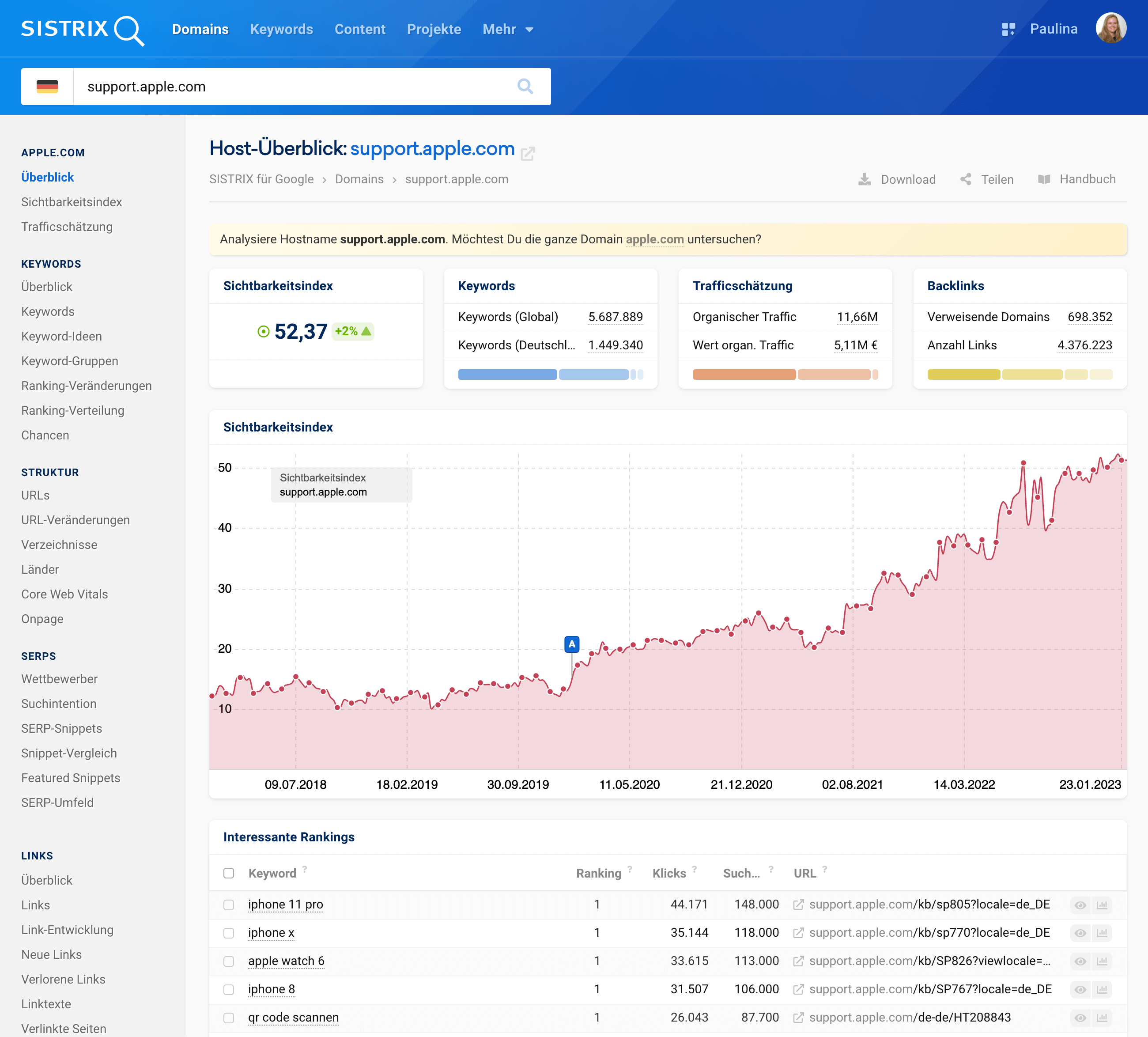 Auf der Seite des Hostüberblicks findest du die wichtigsten Kennzahlen zu diesem Host: Den Sichtbarkeitswert, Zahlen zu den Keywords des Hosts, Trafficzahlen, Angaben zu den Backlinks und du findest dort den Graphen des Sichtbarkeitsverlaufs sowie interessante Rankings.