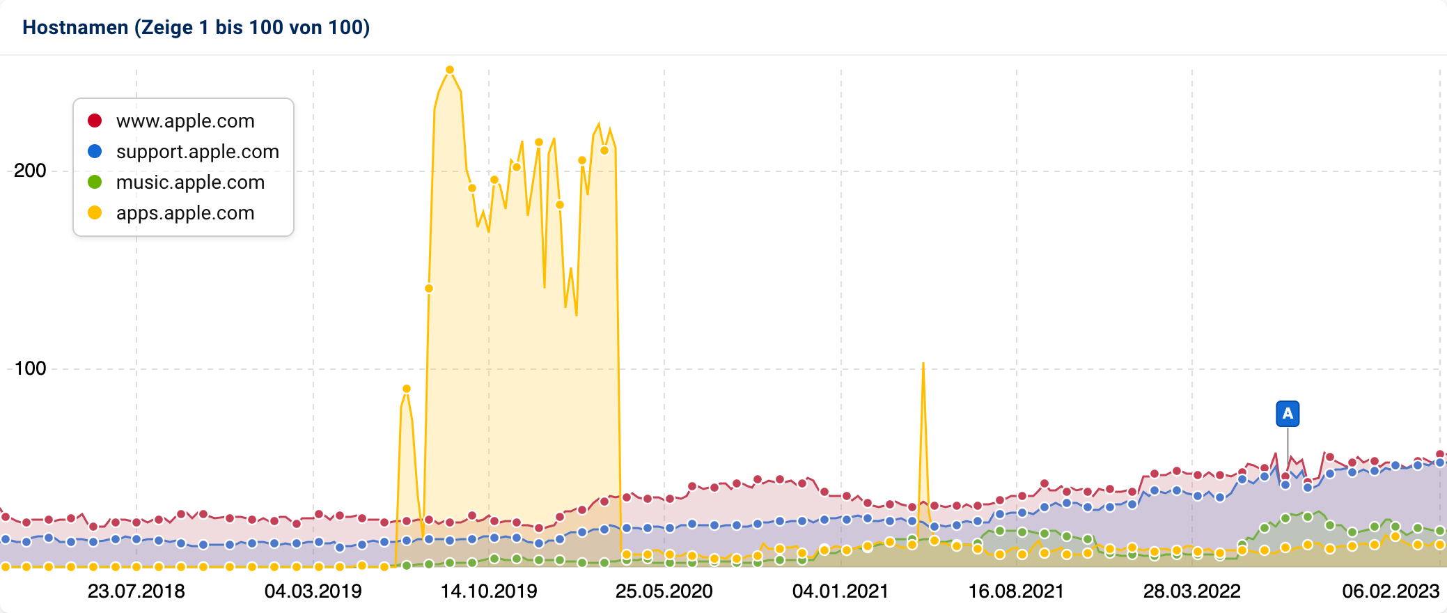 Im Verlauf oberhalb der Tabelle sehen wir, dass der apps-Host Mitte 2019 sprungartig aus dem Boden geschossen ist. Normalerweise ein sehr gutes Zeichen, dass hier ein oder mehrere andere Hosts auf einen neuen zusammengefasst wurden.
