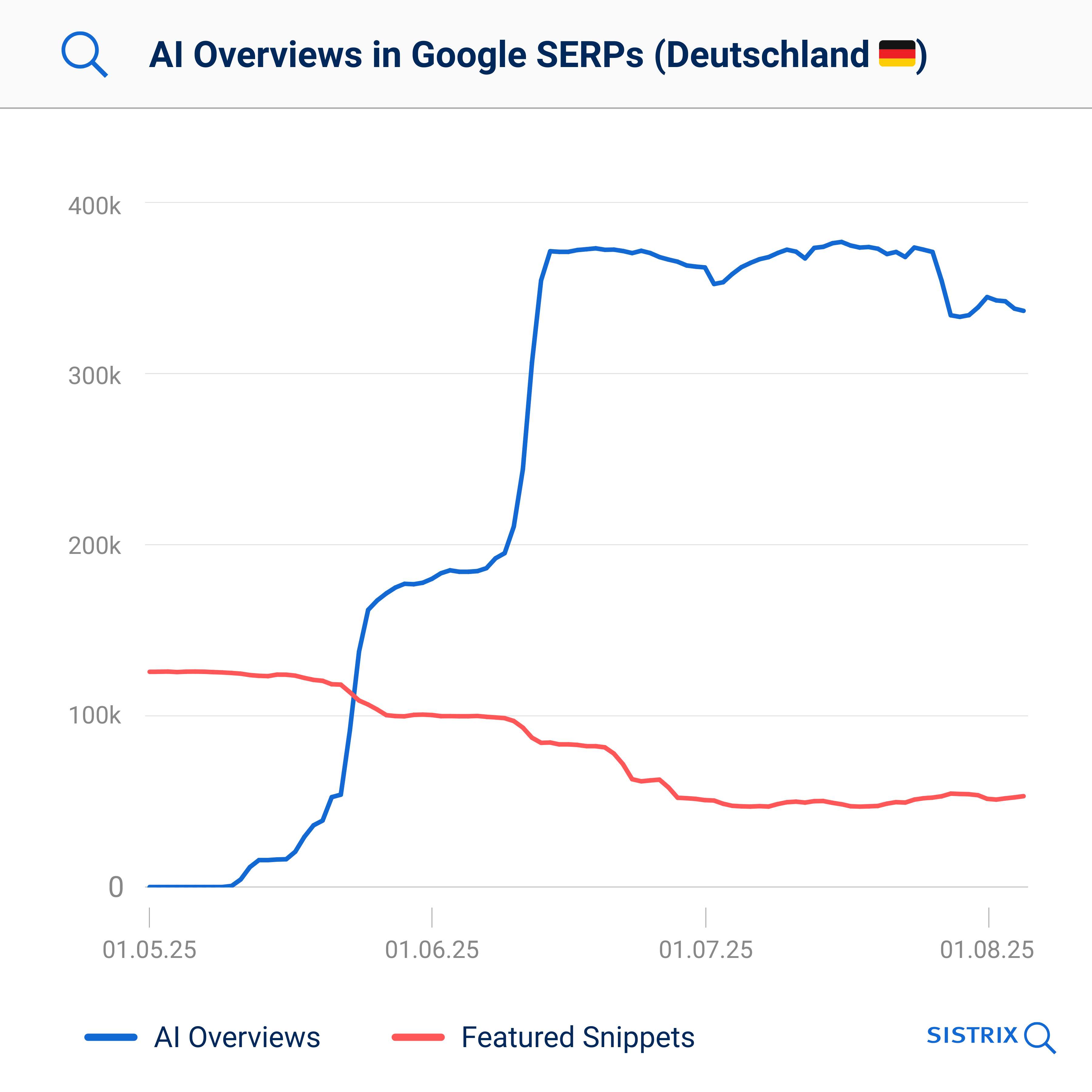 Seit Mai 2025 erscheinen AI Overviews auch in Deutschland flächendeckend. Zunächst stieg die Anzahl der Antwortboxen recht schnell, nun stagnieren die Verbreitungszahlen eher. Bei rund 17 Prozent aller Suchanfragen sind aktuell AI Overviews sichtbar.