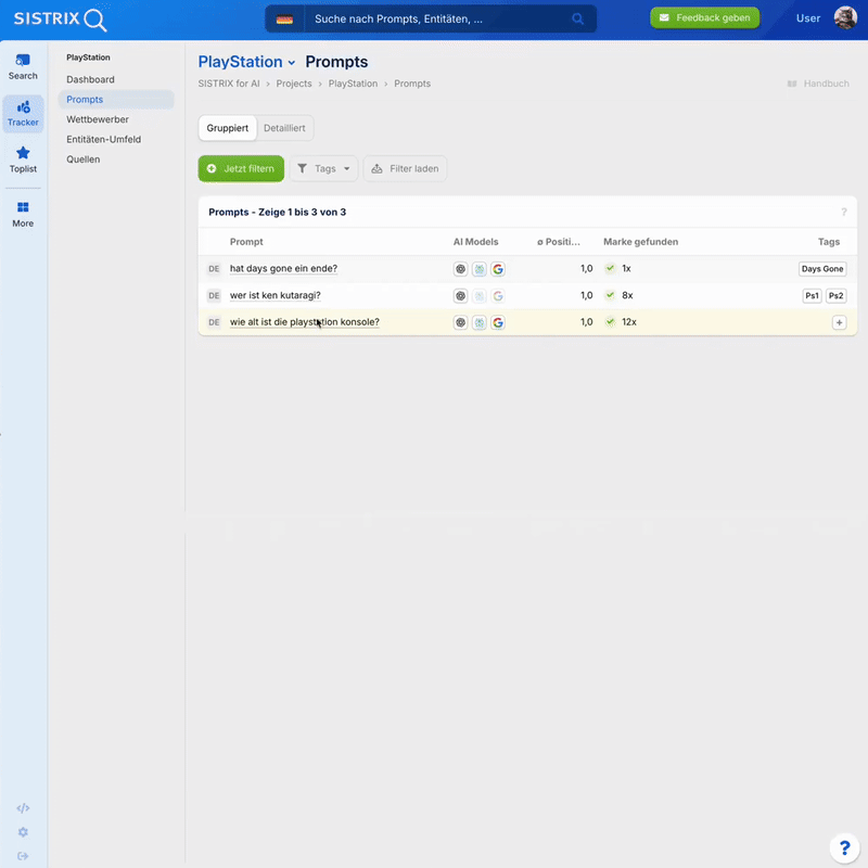 KI Suchmaschinen liefern keine festen Rankings, sondern dynamische Antworten. Umso wichtiger ist es zu wissen, ob und wie die eigene Marke darin auftaucht. Projekte helfen dir dabei, diese Sichtbarkeit regelmäßig zu überwachen und Veränderungen im Blick zu behalten.