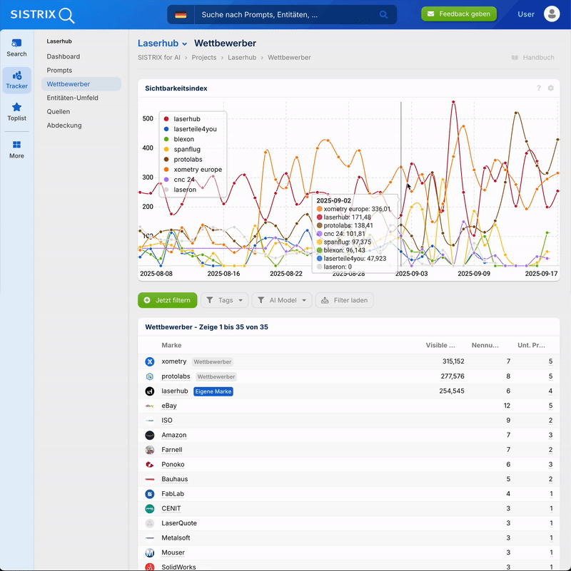 Nur wenn du Entwicklungen im Blick hast, kannst du den tatsächlichen Fortschritt erkennen. Der zeitliche Verlauf deiner Prompts zeigt dir, wie sich die Sichtbarkeit verschiebt, welche Maßnahmen wirken und wann Wettbewerber stärker werden.