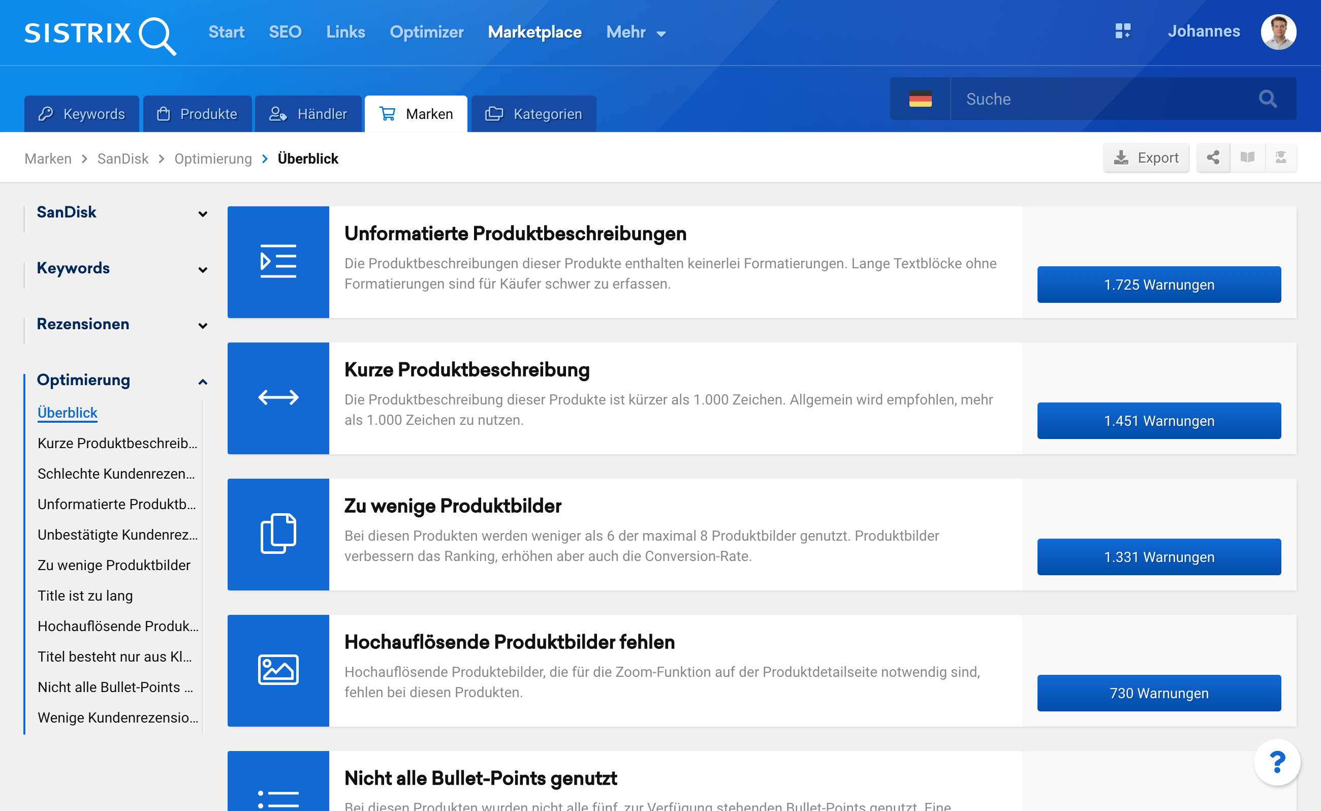 Damit du den Überblick nicht verlierst: alle von SISTRIX analysierten Produkte werden auf die Einhaltung grundlegender Optimerungsregeln überprüft und bei Fehler hervorgehoben. Auf dieser Basis kannst du deine Produkt systematisch optimieren.