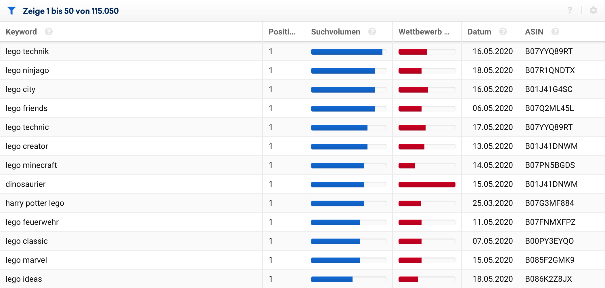 Durch das Zusammenführen dieser Daten in unserem nützlichen Marketplace-Tool, kannst du Produkte erfolgreicher platzieren, indem du z. B. verwandte Keywords finden und nutzen kannst. Unsere Marketplace-Daten enthalten auch Informationen über das relative Suchvolumen von Keywords. Wie oft werden die Daten aktualisiert?Die Ranking- und Keyword-Daten werden kontinuierlich aktualisiert. Wir aktualisieren viele häufig gesuchte Keywords täglich, weniger häufig gesuchte Keywords hingegen wöchentlich. Alle Daten werden jedoch mindestens einmal im Monat aktualisiert. Wo kommen die Daten her?Wir verwenden verschiedene Keywordquellen, die wir in einer Datenbank zusammenführen. Dazu gehören unter anderem echte Nutzerdaten. So stellen wir sicher, dass die Ergebnisse so gut wie möglich mit der Realität der Suche bei Amazon übereinstimmen. |