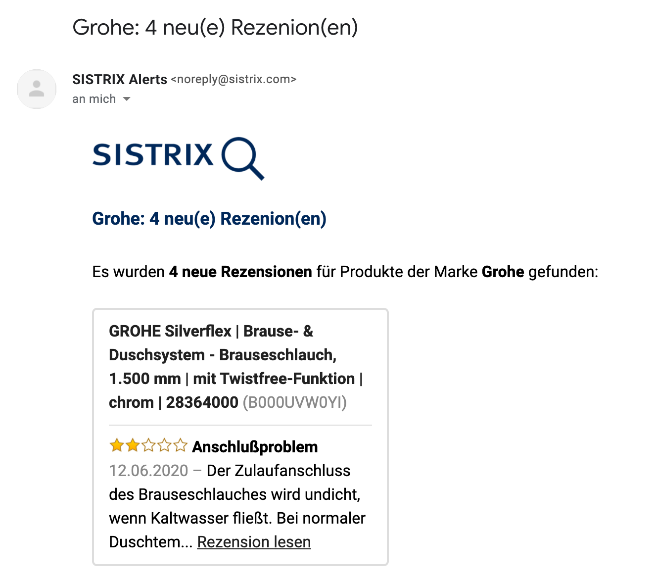 Du möchtest über neue (negative) Kundenrezensionen einer Marke per E-Mail informiert werden? Kein Problem – mit den SISTRIX Alerts erhältst du alle neu gefundenen Bewertungen zu einer beliebigen Marke in deine Inbox. Täglich frisch.