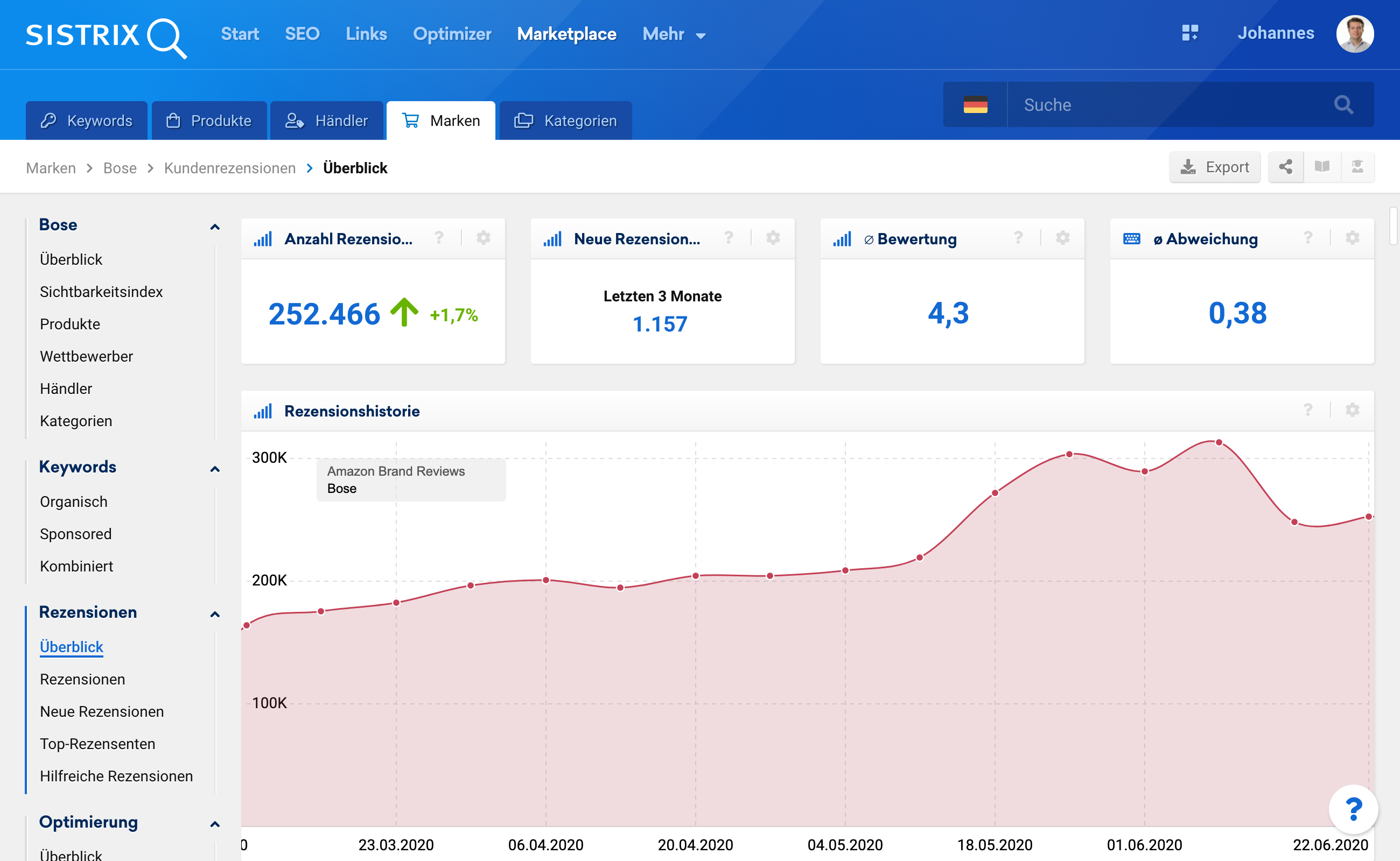 Bei Amazon veröffentlichte Kundenrezensionen zeigen dir die öffentliche Wahrnehmung und Meinung zu einer Marke. Mit SISTRIX kannst du Bewertungen zu Marken und Produkten im Handumdrehen analysieren.