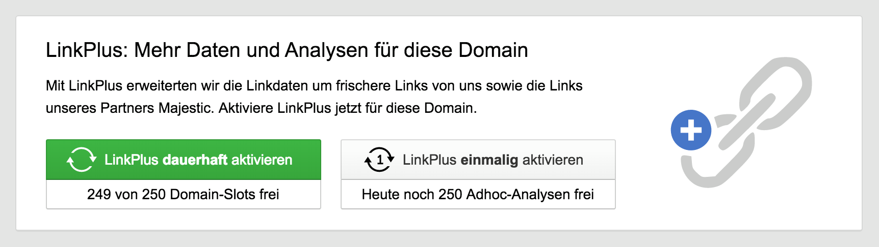 Mit LinkPlus bietet das Link-Modul der Toolbox topaktuelle Links, die Integration der Majestic-Links sowie umfangreiche Analysen. Neben der Option, LinkPlus dauerhaft für eine Domain zu aktivieren, besteht jetzt die Möglichkeit, LinkPlus einmalig für eine Domain zu nutzen. Für diese Ad-hoc-Analysen gibt es neben dem Button zur dauerhaften Aktivierung nun einen zweiten Button für die einmalige Aktivierung. Pro Account kann dieses Feature jeden Tag 250 mal genutzt werden.