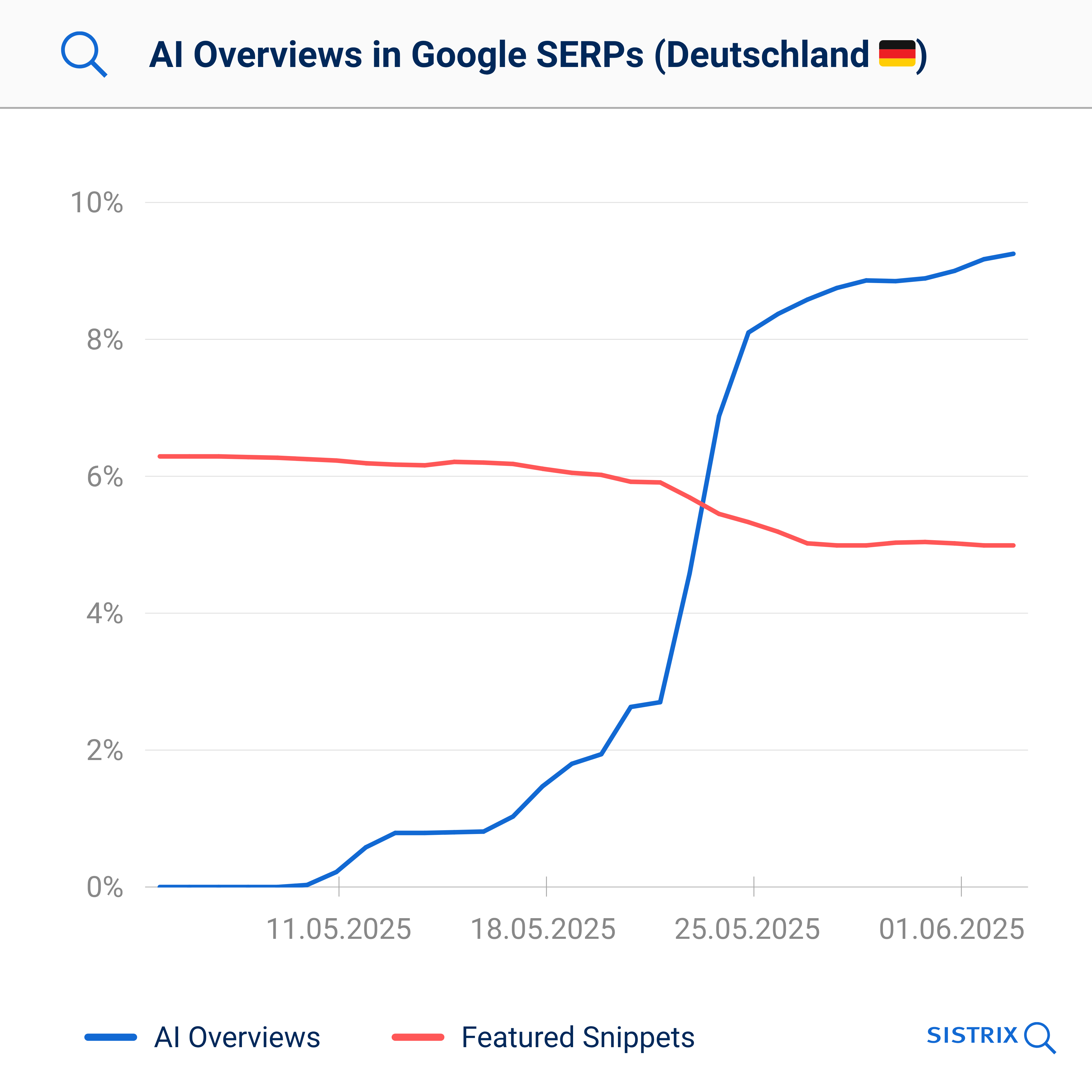 In Deutschland sind AI Overviews aktuell bereits bei fast jedem zehnten Keyword präsent.