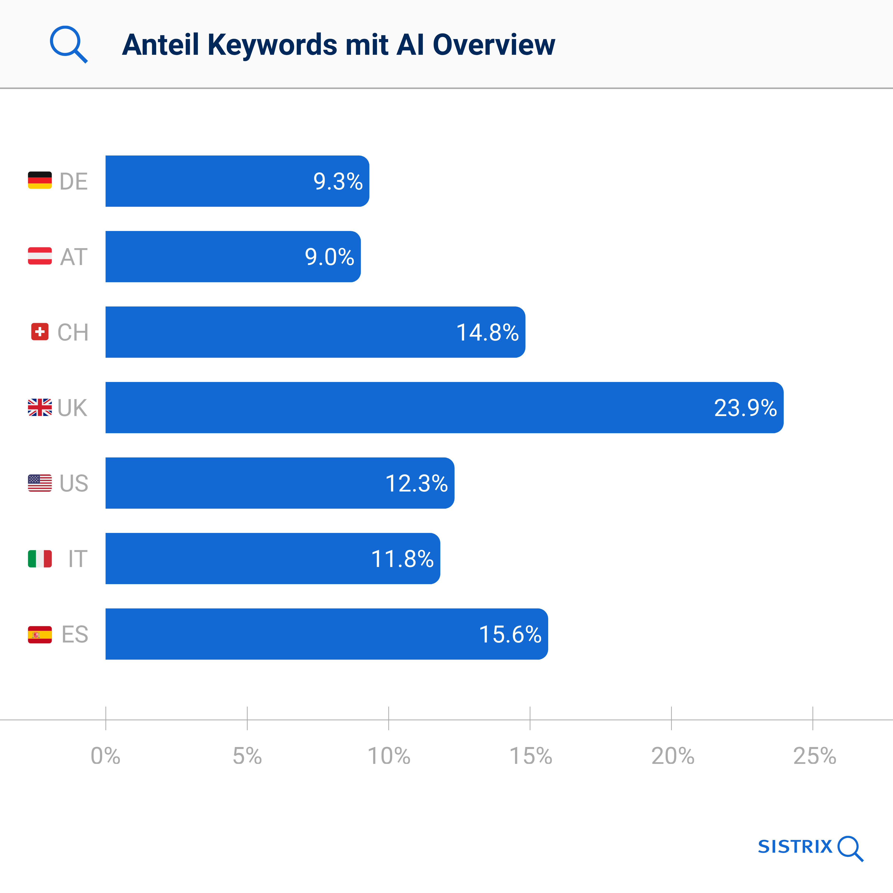 Im internationalen Vergleich ist die Verbreitung der AI Overviews in Deutschland noch moderat. Lediglich in Österreich messen wir derzeit eine geringere Ausspielungsrate. Klarer Spitzenreiter ist das Vereinigte Königreich, wo bei fast einem Viertel aller Keywords AI Overviews erscheinen. Auch Spanien liegt mit über 15 % deutlich vor Deutschland. Die Tendenz ist somit klar.