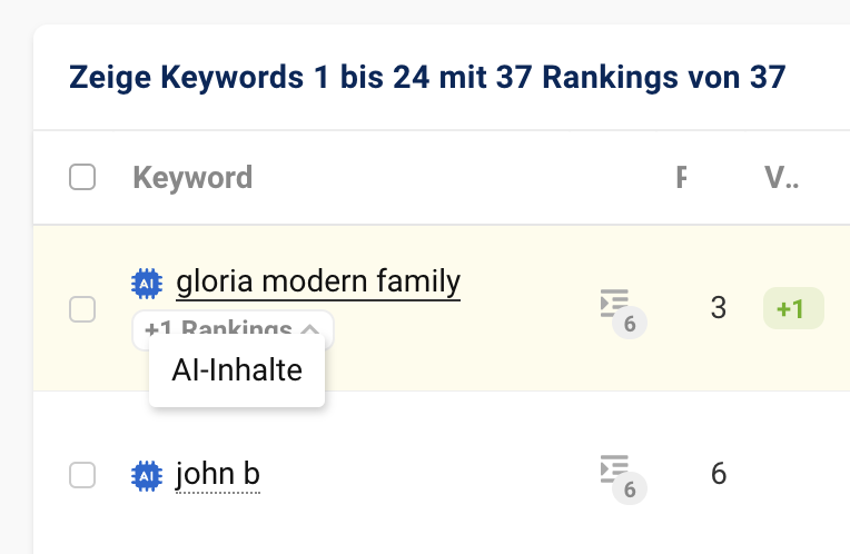 Darüber hinaus markieren wir diese neuen Treffer auch in den Keyword-Listen mit einem entsprechenden Icon. So können Keywords, bei denen Google AI-Inhalte ausspielt, schnell erkannt werden.