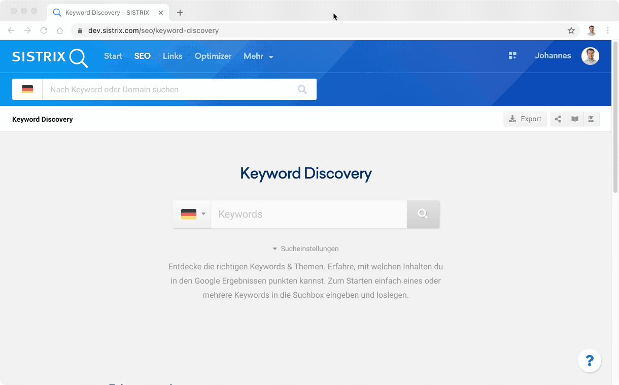 Keyword Discovery ist unser Universal-Werkzeug zur Keyword-Recherche: du gibst ein Keyword ein, wir zeigen dir viele ähnliche und verwandte Keywords inklusive relevanter Kennzahlen wie dem Suchvolumen.