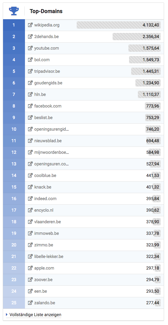 Zum anderen beschränken wir die Positionsermittlung in diesen Ländern auf die ersten zehn Treffer. Auswertungen zeigen regelmäßig, dass über 90% aller organischen Klicks auf der ersten Trefferseite stattfinden (Mobile sogar noch deutlicher). So können wir einen Großteil des Nutzens zu einem Teil der Kosten abdecken und kleinere Länder wie Belgien, Irland und Portugal anbieten.